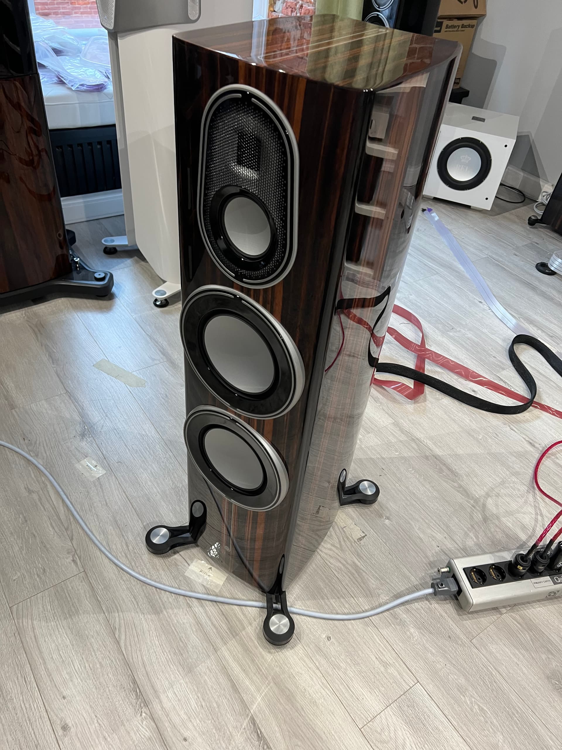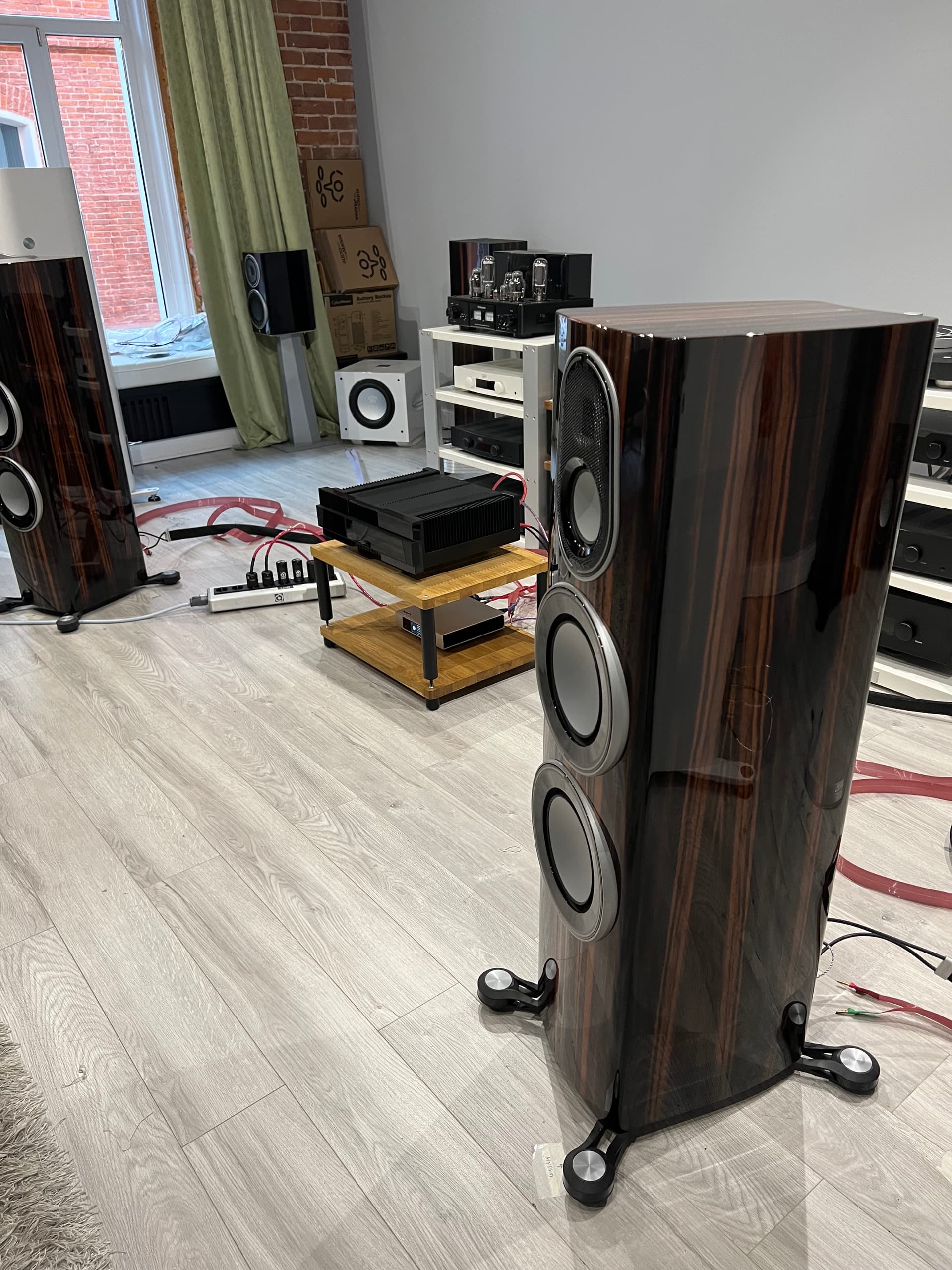 Понимая, что комната играет огромную роль в восприятии акустики договорился на прослушку Platinum 3G 300 в Barnsly. Здесь они тоже подошли без фанатизма к акустическому оформлению - никаких панелей, басовых ловушек, толстых ковров по всему полу. Половина стен, похоже, в гипсокартоне, половина “под кирпич”. Но акустика и место прослушивания выставлены по феншую - по третям длины комнаты: 1/3 - кресло, 2/3 - акустика и аппаратура задвинута далеко вглубь от плоскости акустики. Большие окна наполовину заштореные портьерами. Потолок метра 4 или 5. Дверь была закрыта.