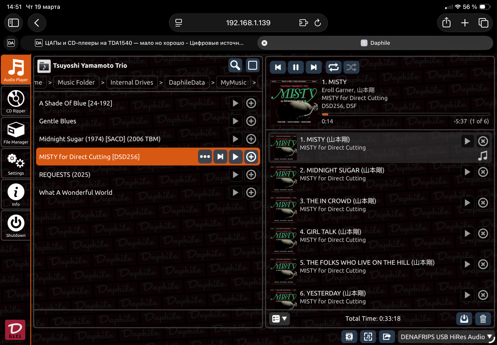Жаль только, что цифровой оригинал этой записи издан в 44/16 PCM на CD-Audio (для чего, кстати, и прекрасно годится сабж). А вот то, что вы увлеченно слушаете в DSD256 - это уже неведома зверушка, сделанная чтобы на ДС даке как-то это зазвучало ))