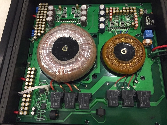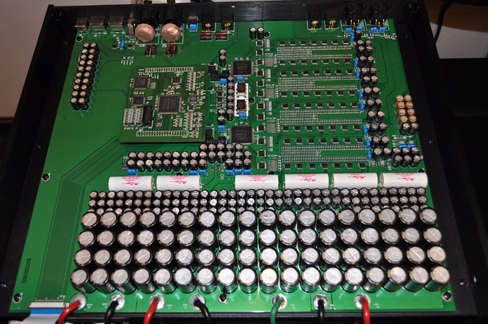 К конструктиву ЦАП. Основная информация находится на основном сайте компании http://www.denafrips.com Коротко, в Terminator по два 26bit R2R модуля на канал, CRYSTEK FEMTO Clock, FIFO, FPGA. В общем используют передовые технологии, своё ноу-хау на весьма достойных комплектующих. DCP плата поддерживает обновления, так что в будущем возможна корректировка ПО. Питают плату ЦАП два немаленьких трансформатора, отдельно на цифру и аналог. Все детали обеих плат видно на фото. Ранее Denafrips делали двухблочные ЦАП, питание было в отдельном корпусе, теперь всё в одном более крупном. Но, платы внутри корпуса крепятся на чёрные стальные кронштейны с цельным днищем. То есть, плату ЦАП от платы питания с трансами отделяют два листа стали. Сам корпус конвертера сделан из весьма толстого алюминия. Вес аппарата 19 кг.! К днищу приклеены три стальных шипа и в комплекте три подставки под шипы из стали и похоже дерева. Требует очень аккуратной установки на стойку!