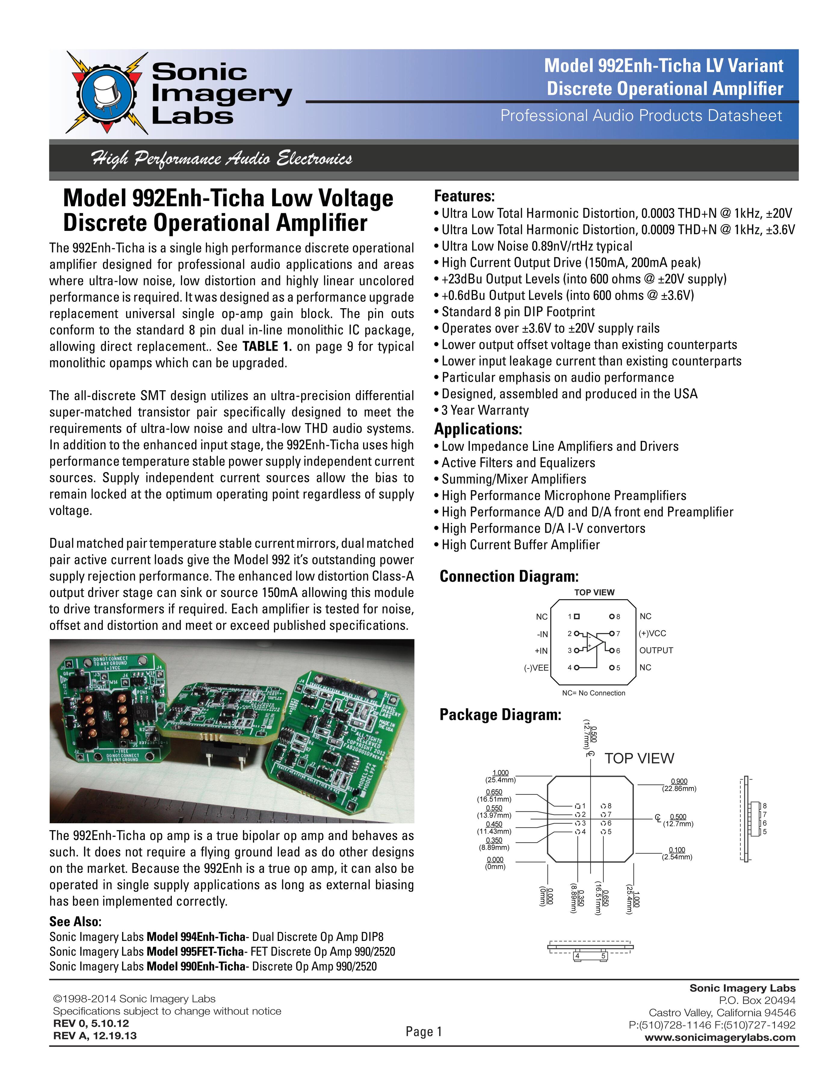 992 Enh-Ticha одноканальный дискретный операционный усилитель сконструирован для профессиональных тональнозвуковых применений и зон где необходимы ультра-низкий шум и низкое искажение.