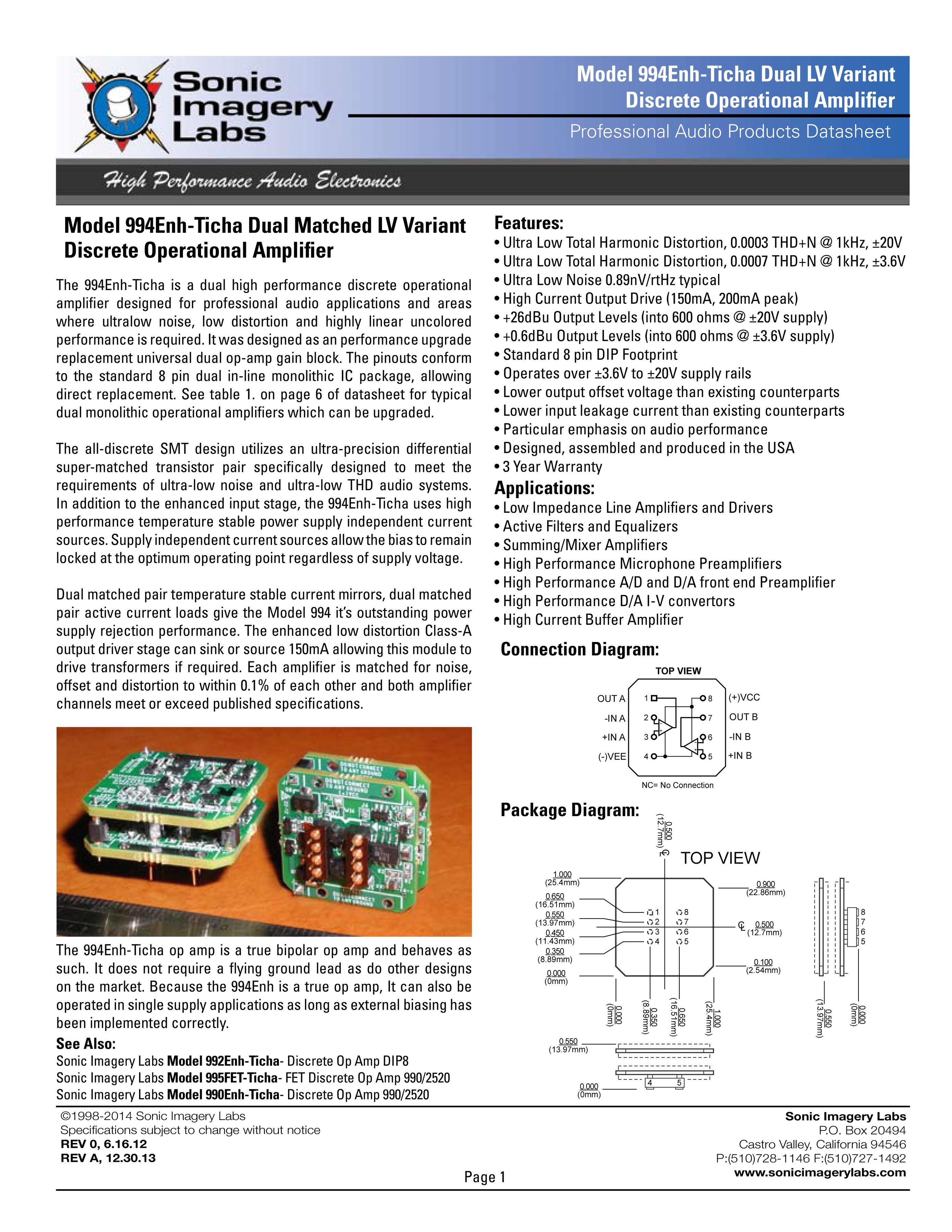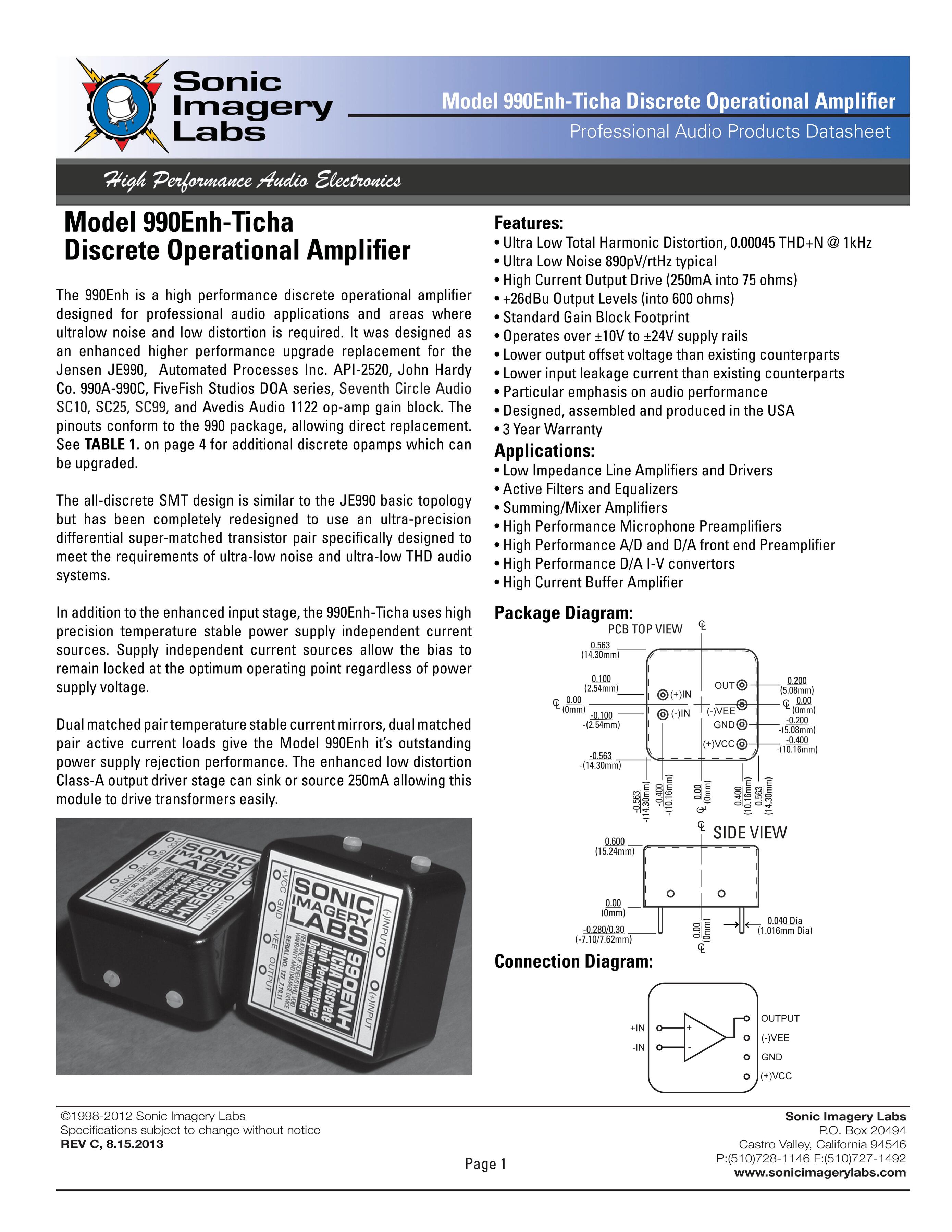 Модель 990Enh-Ticha представляет собой высокопроизводительный дискретный операционный усилитель, предназначенный для профессиональных областей применения звука, где требуется ультра-низкий уровень шума , низкие искажения и высокая линейная неокрашенная работа . Он был конструирован как высококачественная замена Jensen JE990, Automated Processes Inc. API-2520, John Hardy Co. 990A-990C, FiveFish Studios DOA series, Seventh Circle Audio SC10, SC25, SC99, and Avedis Audio 1122 op-amp gain block.