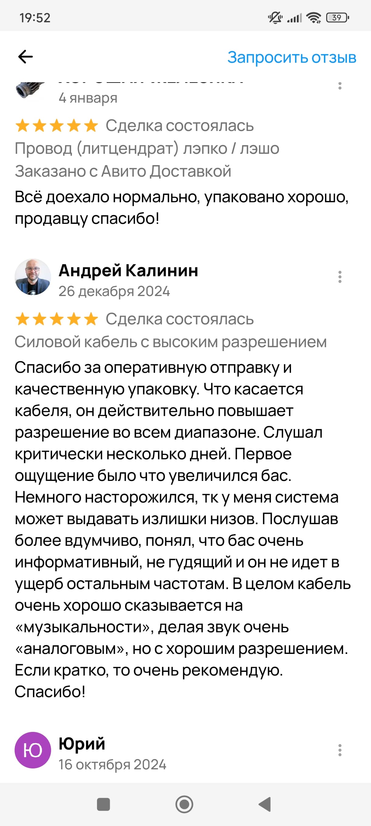 Мои “уши” согласны с Андреем Калининым, практически во всем, кабель с хорошим разрешением, “музыкальный” - достоверная и красивая передача тембров звучания акустических инструментов и голоса, эффект “аналоговости” присутствует, хорошо впишется в системы имеющие склонность к аналитичному звучанию, он несколько его сбалансирует.
