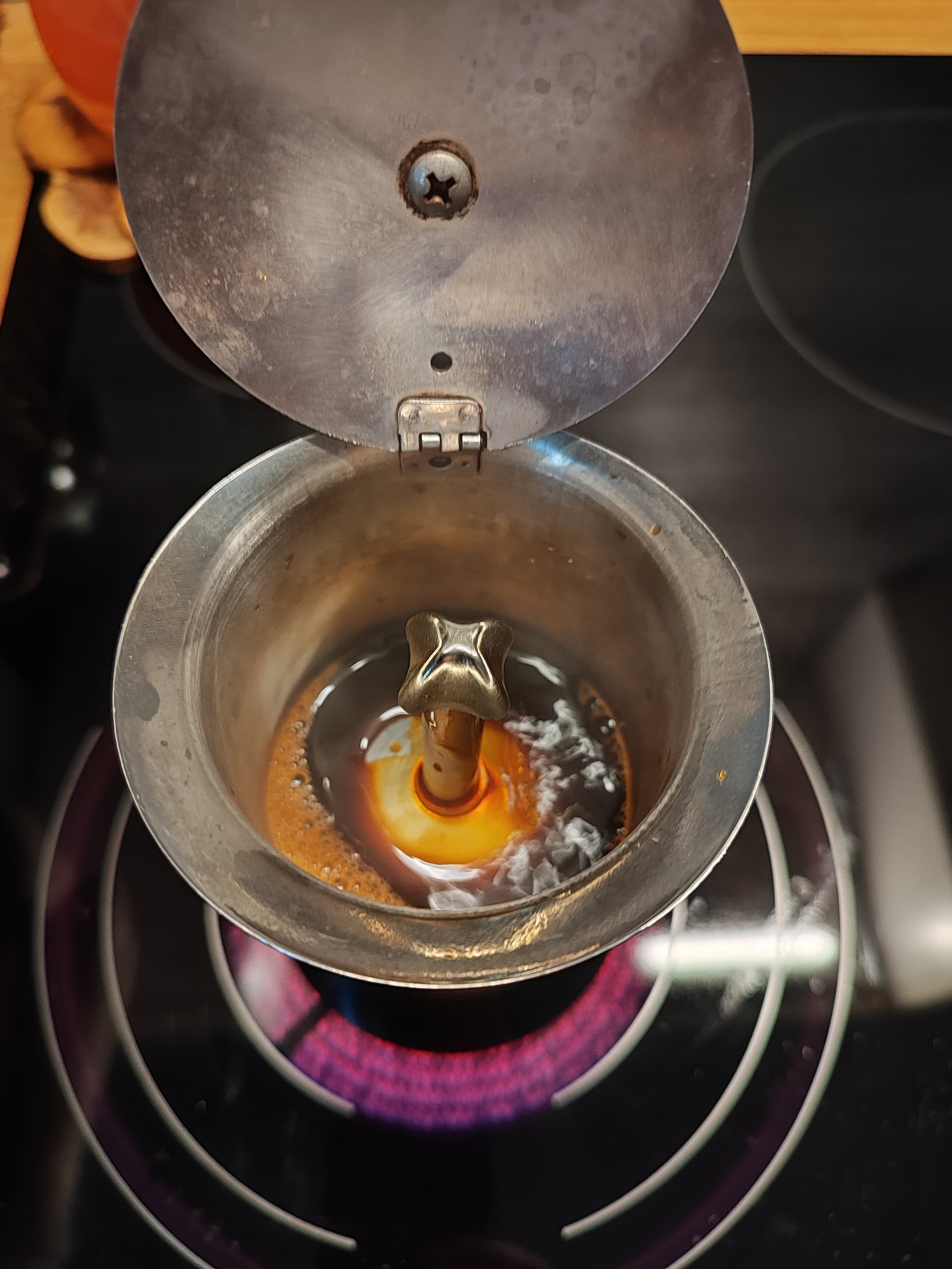 Варил 7 минут (плита обычная, поставил по ошибке на самую маломощную). Так как сейчас пью в меньших дозах, снял не дождавшись полного пролива. Залил в чашку, перемешал, разбавил водой.
