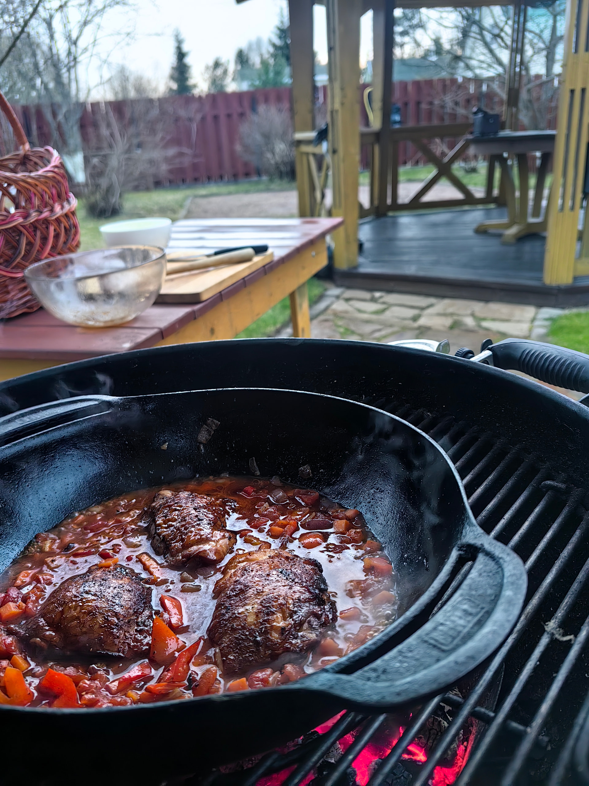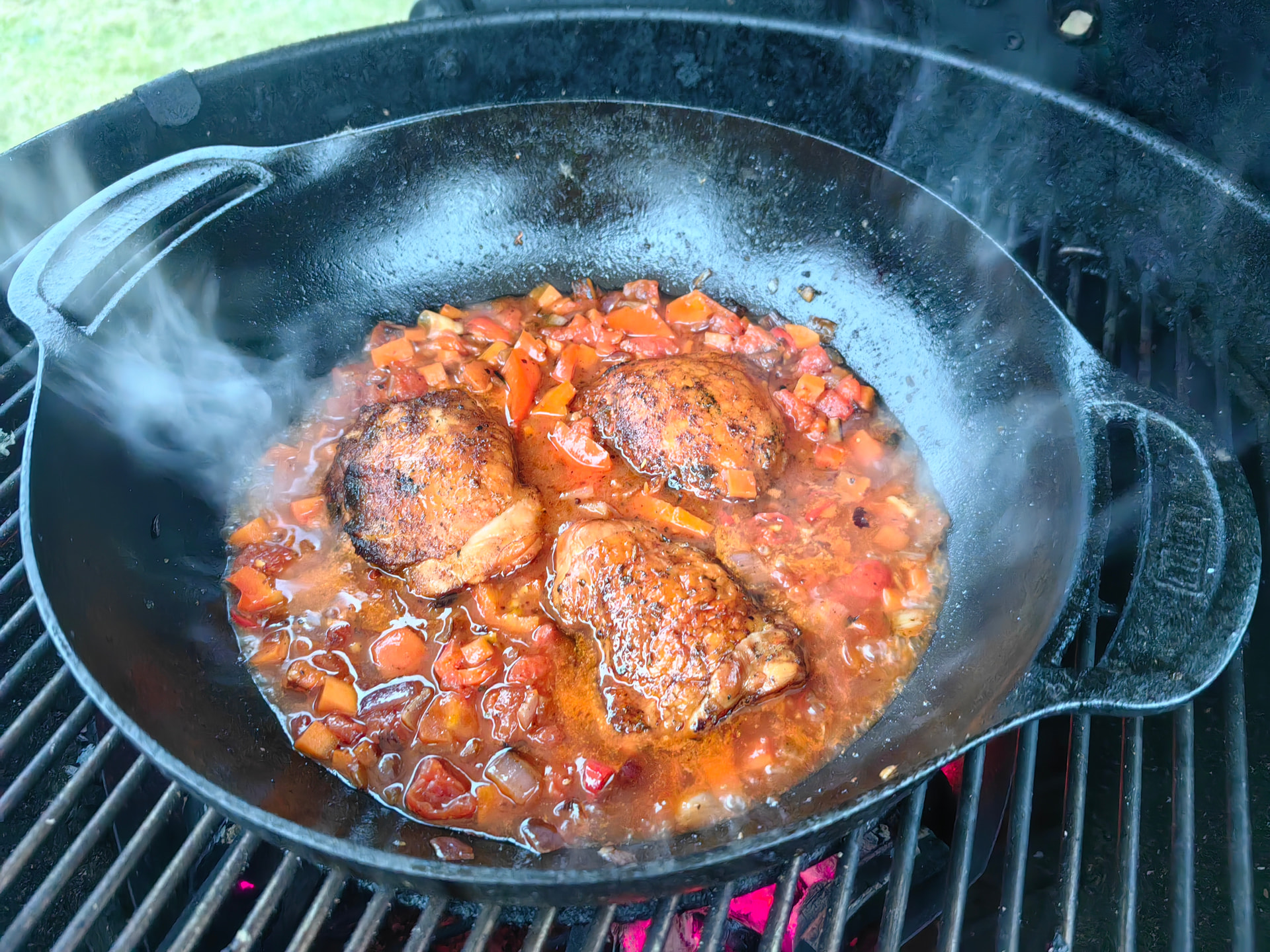 Разминаемся перед сРеалом - курочка каччиаторе. Подкоптить на вишневых чанках, затем овощи, томаты и куриный бульон.