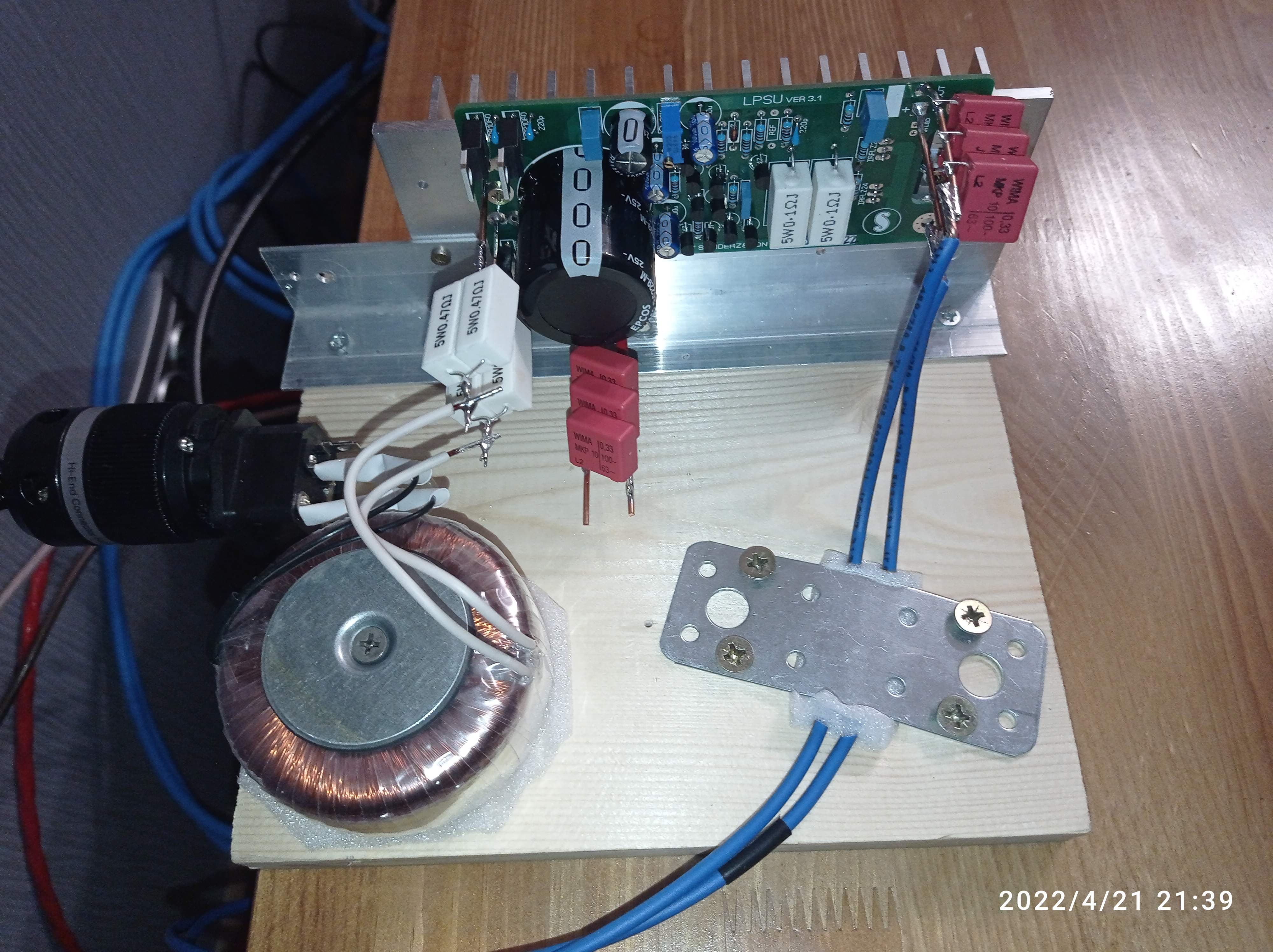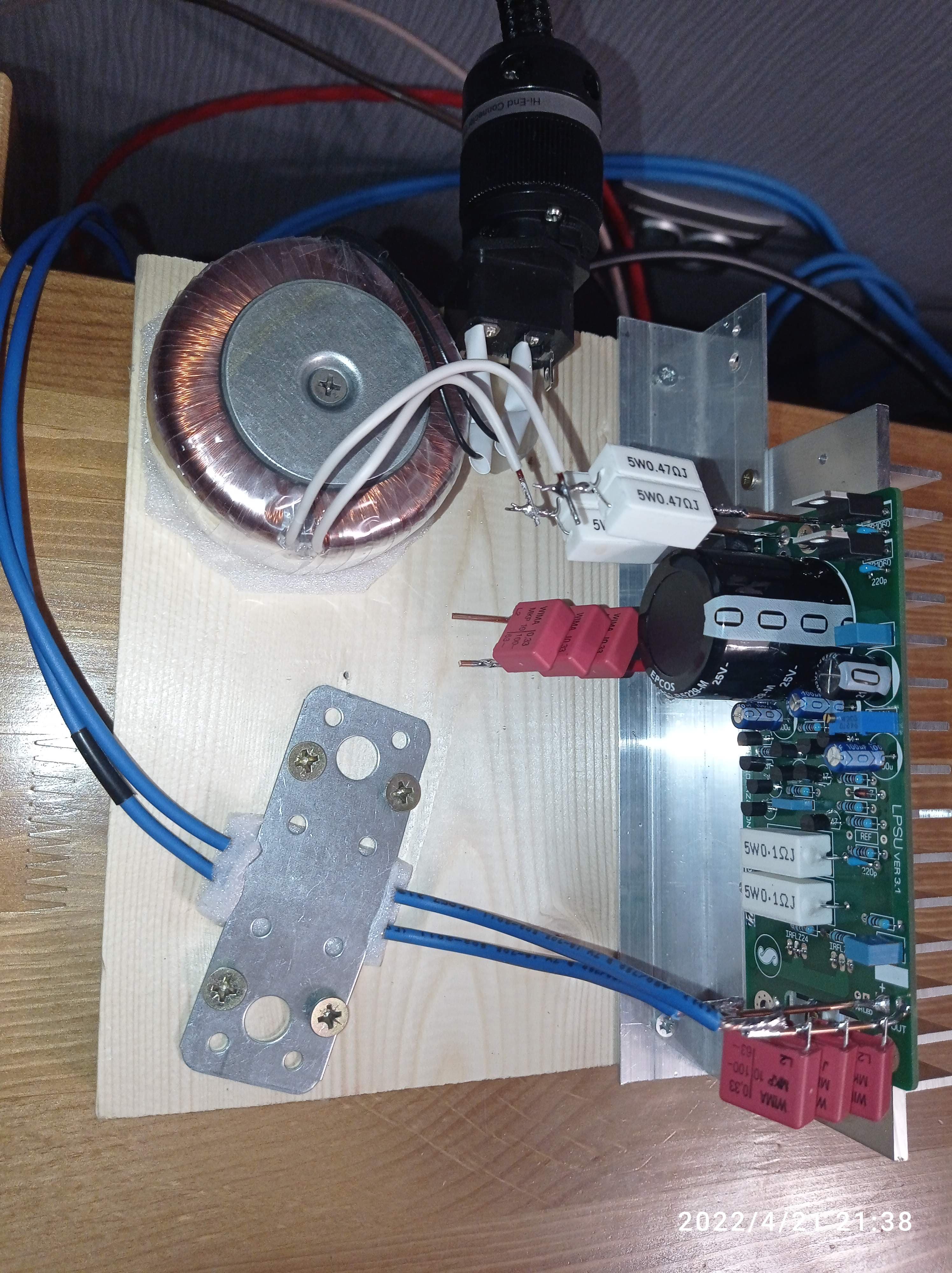 Думаю, Сергей применил именно это решение, так как этого достаточно для питания плат, у которых и так уже на входе сверх-малошумящие LDO стоят - как например Pi2Aes с такой же платой в туровом DAStreamer. А шунты нижнего резистора делителя обоих кренок тут на вид около 220 мкФ (синие Philips/Vishay) - то что нужно. Правда резисторов на выходе кренок нет, но они применяются для предотвращения генерации при использовании Low ESR электролита большого номинала на выходе. А тут на выходе обоих кренок обычный электролит на вид 470 мкф, с ним не должны кренки в возбуд уходить. Зато на входе Pi2Aes Сергей поставил огромный Ultra-low ESR электролит на вид 1000 мкф Elna Cerafine. А зачем Сергей решил маркировку затереть - наверное, чтобы народ не воротил нос, типа, это же простые ЛМ-ки, хоть и в двухкаскадном включении.