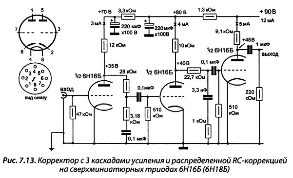 Особенность данной схемы это распределённая пассивная цепь коррекции и применение нулевого фиксированного смещения на всех каскадах, что позволило катоды ламп жёстко “посадить на землю” и добиться минимального числа компонентов на пути сигнала. В этом устройстве я применил все межкаскадные конденсаторы винтажные советские с бумажным диэлектриком, для обеспечения максимально естественного звучания. Электролитические конденсаторы оригинальные Nippon, в цепи коррекции Wima.