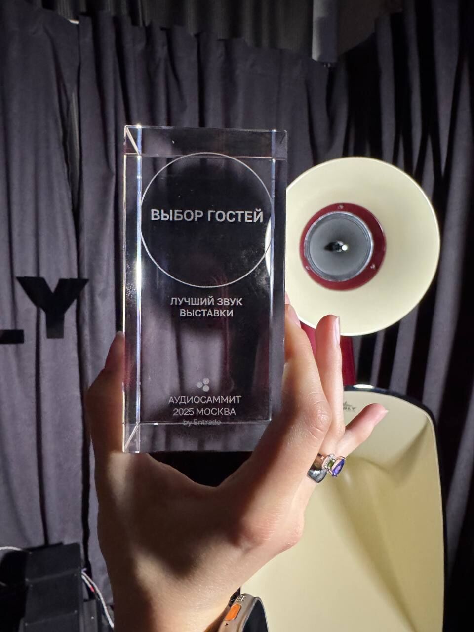 Прежде всего, это премия TOP High End, то есть профессионального жюри, в номинации Лучшая напольная активная/пассивная акустическая система от 1 млн. руб. Этой же премией награждены еще несколько участников. Учитывая компетенции самого жюри, размер выставки (11 этажей звука), учитывая плотность комнат и залов, учитывая какие серьезные ребята с мировым именем выставляются, попасть в эту номинацию очень и очень престижно. Спасибо за высокую оценку нашего творчества.