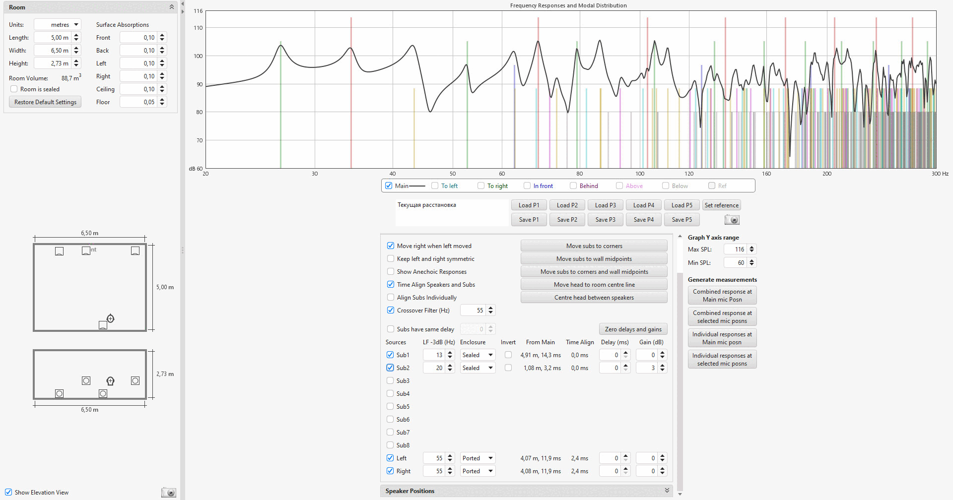 Два саба в комнате по одной стене- вообще не прогнозируемый результат. Худший и самый сложный вариант настройки (если конечно нужна правильная более менее ровная настройка). Результирующая АЧХ при интерференции вообще не предсказуема. Только DLBC умеет это делать. Ручками очень сложно. Вроде выравниваешь более менее один саб, второй может в сумме добавлять пики провалы до 6дб. Там танцы с бубном, параметрики, задержки, чтоб пики провалы не накладывались и т.д. Если даже получается иногда более менее нормальный результат в конкретном помещении- это звезды сошлись))