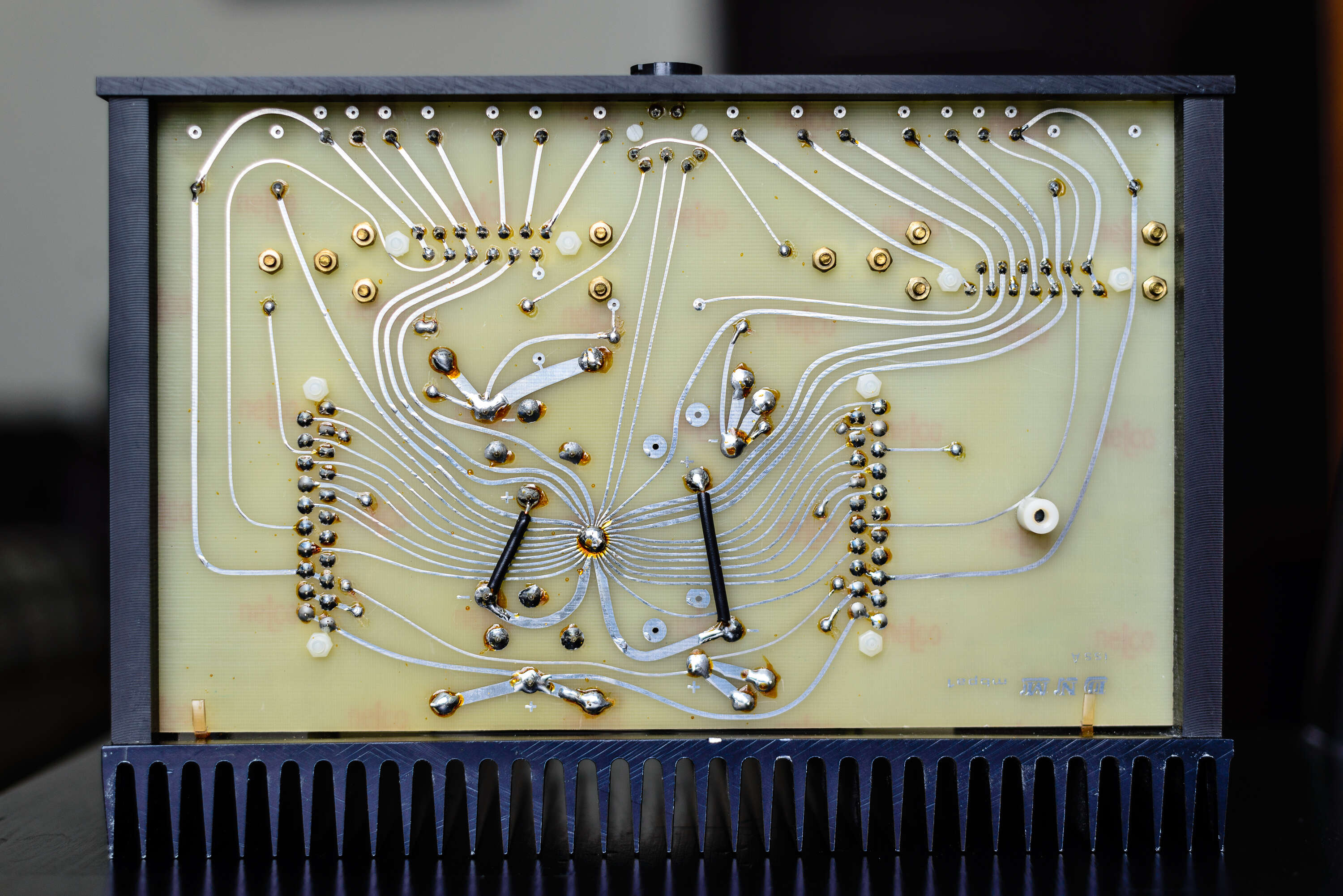 “Фонокорректор представляет из себя двухкаскадный усилитель, каждый выполнен по тотемной топологии. Активными элементами являются транзисторы toshiba, подобранные попарно. В чувствительных участках цепи riaa использованы конденсаторы wima с точностью 1%. В качестве межкаскадных конденсаторов используются подобранные в пары panasonic. Корректор не является копией какого либо «известного» устройства, это собственная разработка, рассчитанная и промоделированная автором. При создании я руководствовался принципом разумной достаточности. Главная задача, которую я попытался решить - получить максимально достойный звук по конкурентноспособной стоимости.