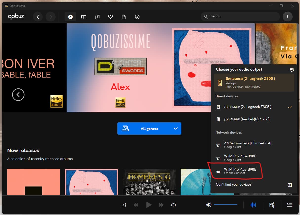 У меня в верхней части приложения, высвечивалась какая то надпись-ссылка(у меня акк аргентинский, поэтому надпись на гишпанском и я не понимал, что там написано). Я ткнул в неё, Qobuz перезапустился и только после этого появились устройства с Qobuz Connect. И то… тоже не прям сразу. Десктопный Qobuz как то у меня долговато ищет сетевые устройства. Хромкасты может по пару минут не видеть.