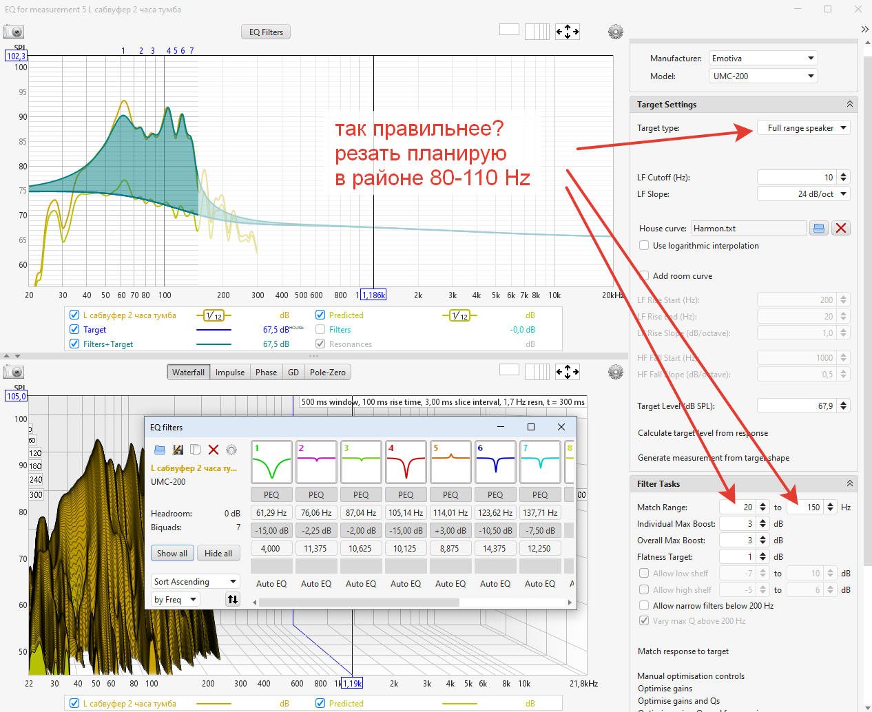 Хочу откорректировать АЧХ при помощи REW и его EQ хочу рассчитать фильтры. Есть измерения колонки и саба без корректировки с учетом комнаты (в точке прослушивания). Вопрос - при расчете фильтров target type указывать full range или как сабвуфер/полочник ? Ощущение такое что PEQ + Crossover будут накладываться если указать частоты раздела. Может PEQ корректировать в линию чуть за границы нужной полосы, а кроссовером уже резать на слух? какая тактика в данном случае? и вообще есть ли разница что за чем идет? сначала PEQ и потом Crossover? или наоборот? запутался совсем(((