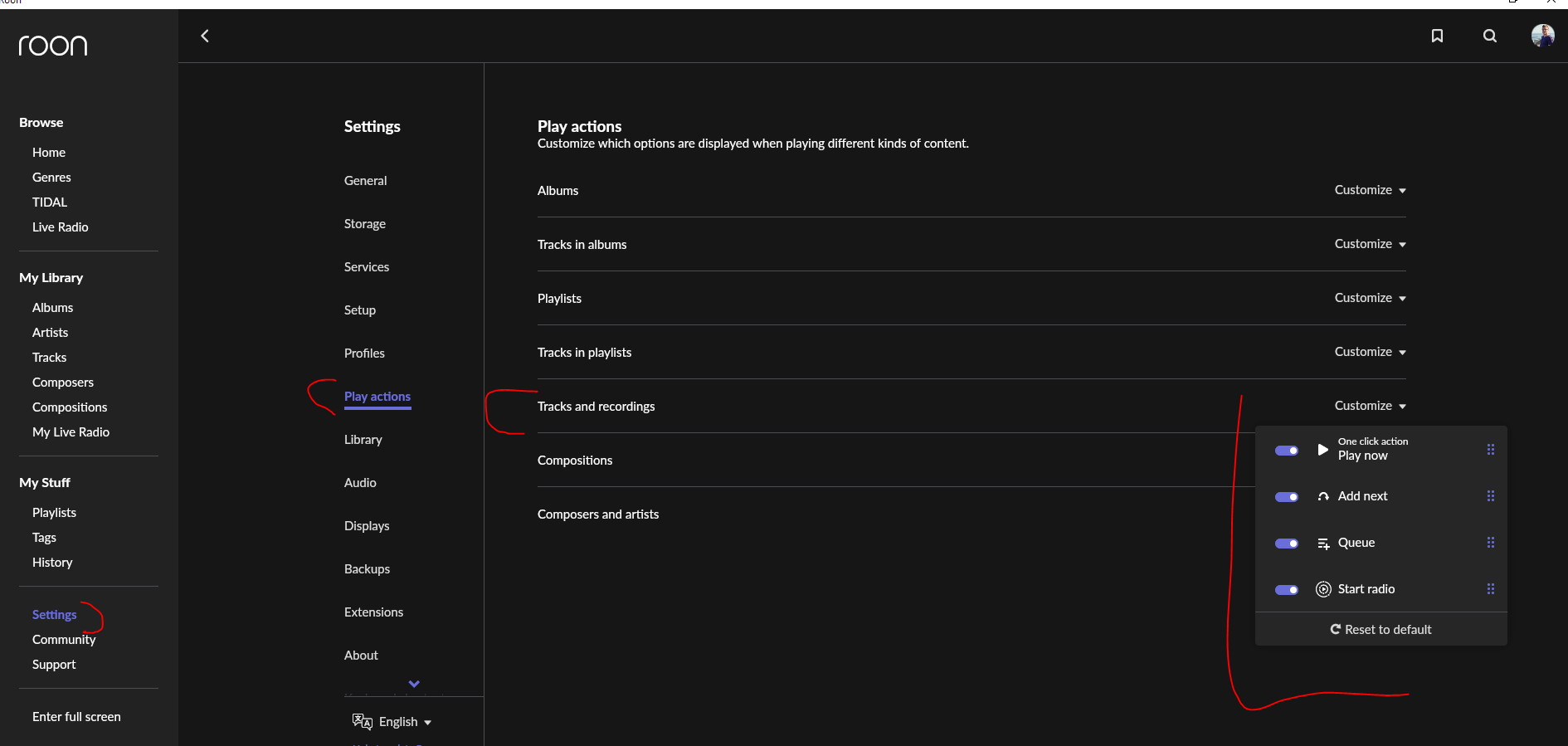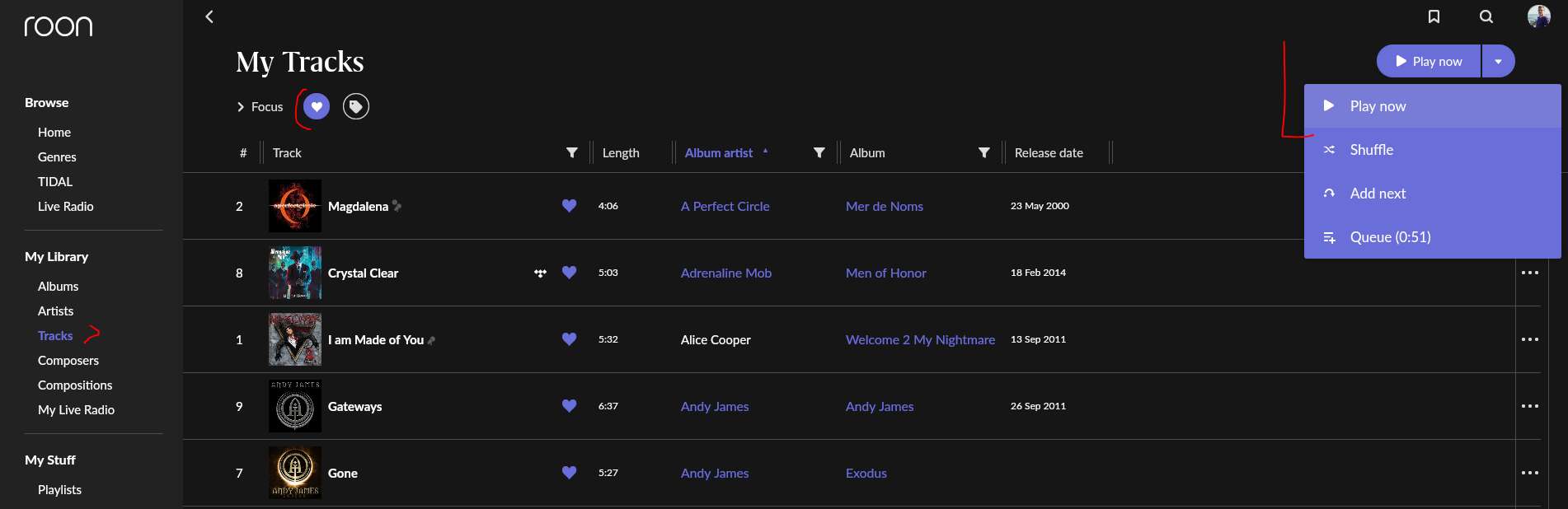Как заставить Roon последовательно или через shuffle играть favorite tracks? Когда я в левом меню выбираю Tracks, а потом вверху