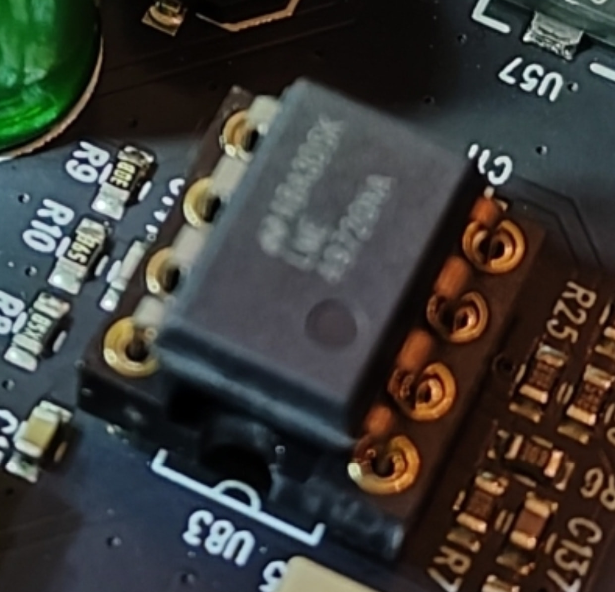 Достать штатные ОУ из кроваток. Установить новые. Полярность надо соблюсти. У кроватки есть полукруглая выемка - там пин 1, соответственно вставляем ОУ. Если ОУ куплен в кроватке, то совмещаем выемки. Если без кроватки, то на корпусе будет выбита точка, символизирующая пин 1. На фото видна набитая точка на штатном ОУ: