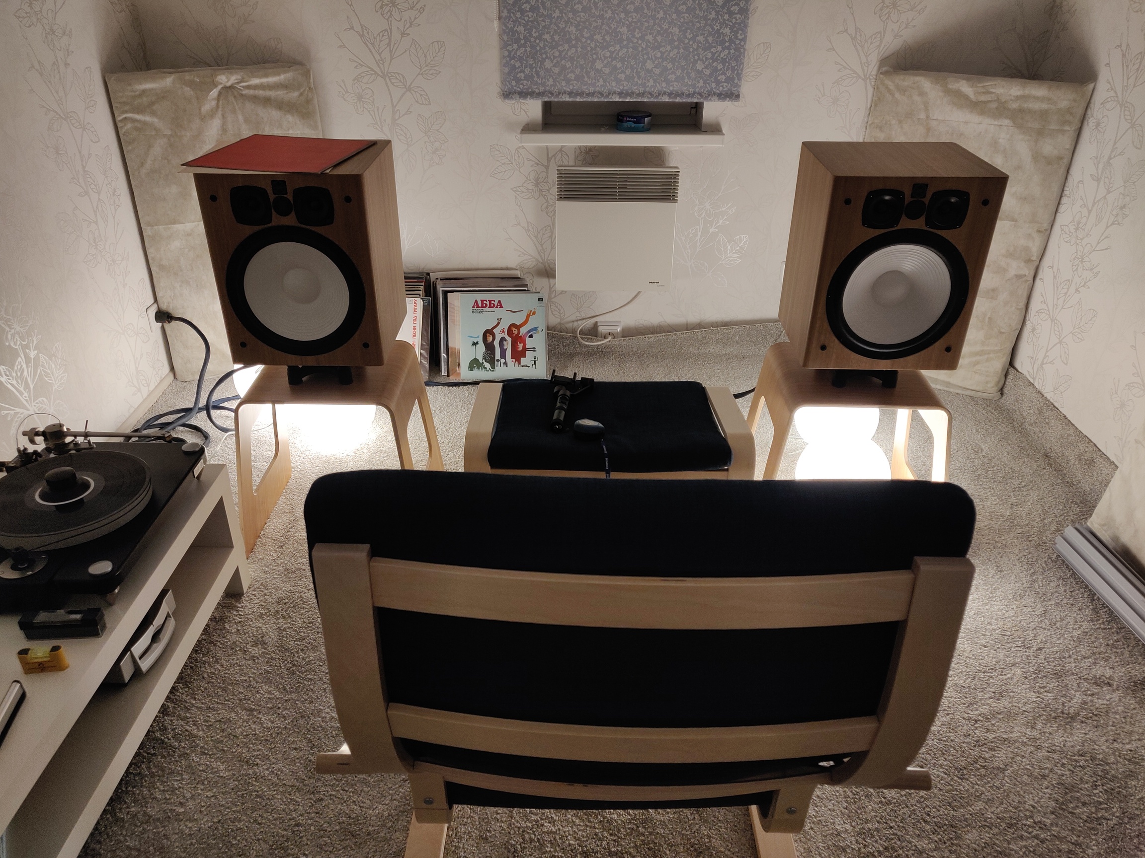 А на полметра ближе к тылу ( голова на спинке дивана) сцена помельче, но за счет прибавки по низу и ослабления высоких комфортно слушать звонкие записи.