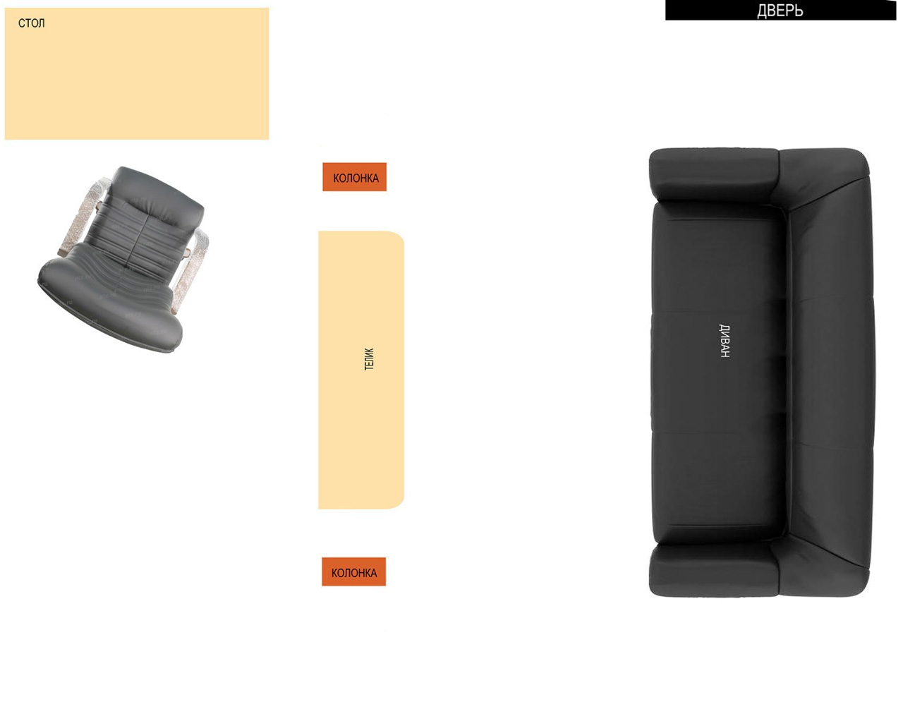Попробуйте нарисовать прямые и отраженные зв.волны в приведенной Вами планируемой схеме расстановки с указанием расстояний до всех стен и других объектов. Желательно с соблюдением масштаба для наглядности. Телевизор, надеюсь, плоский.