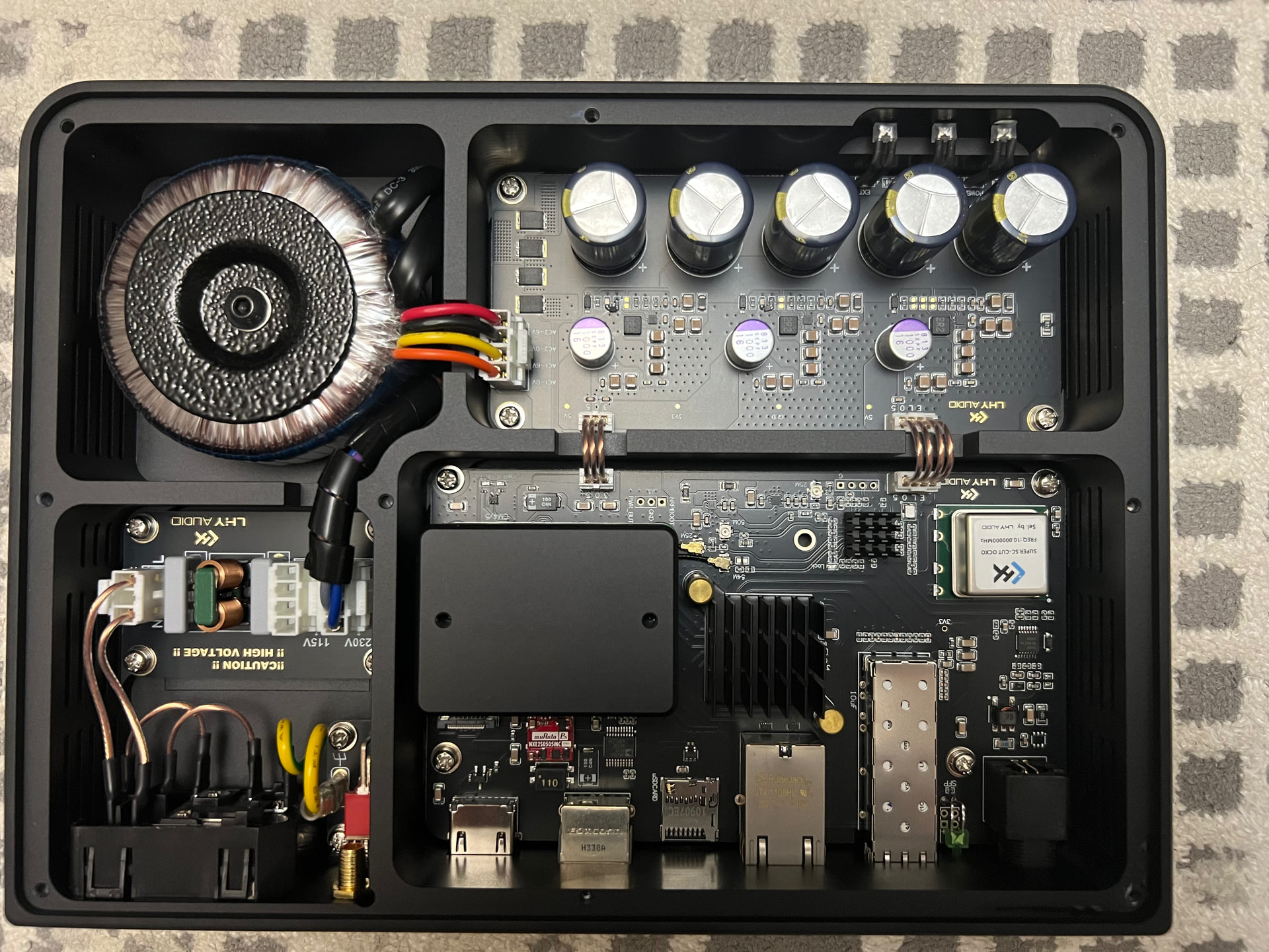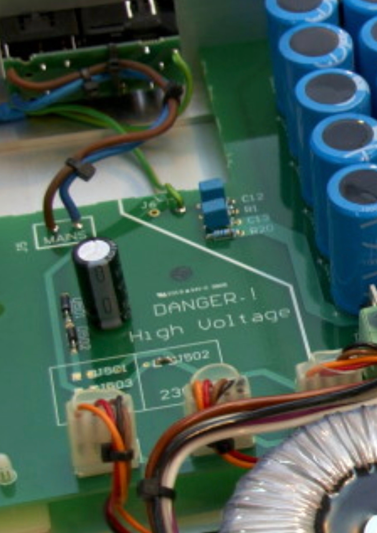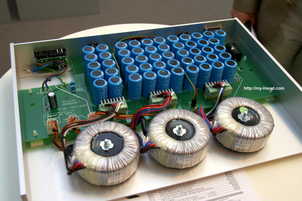 "Блок питания состоит из трёх трансформаторов. Два из них идентичны, каждый обеспечивает мощность 85 ВА и емкость 200 000 мФ. Третий обеспечивает емкость 110 000 мФ. Когда три блока питания поступают в CD-проигрыватель, меньший блок питания отвечает за работу большинства компонентов, таких как цифровой ресивер и транспорт. Два больших блока питания используются только для питания левого и правого каналов аналогового каскада.