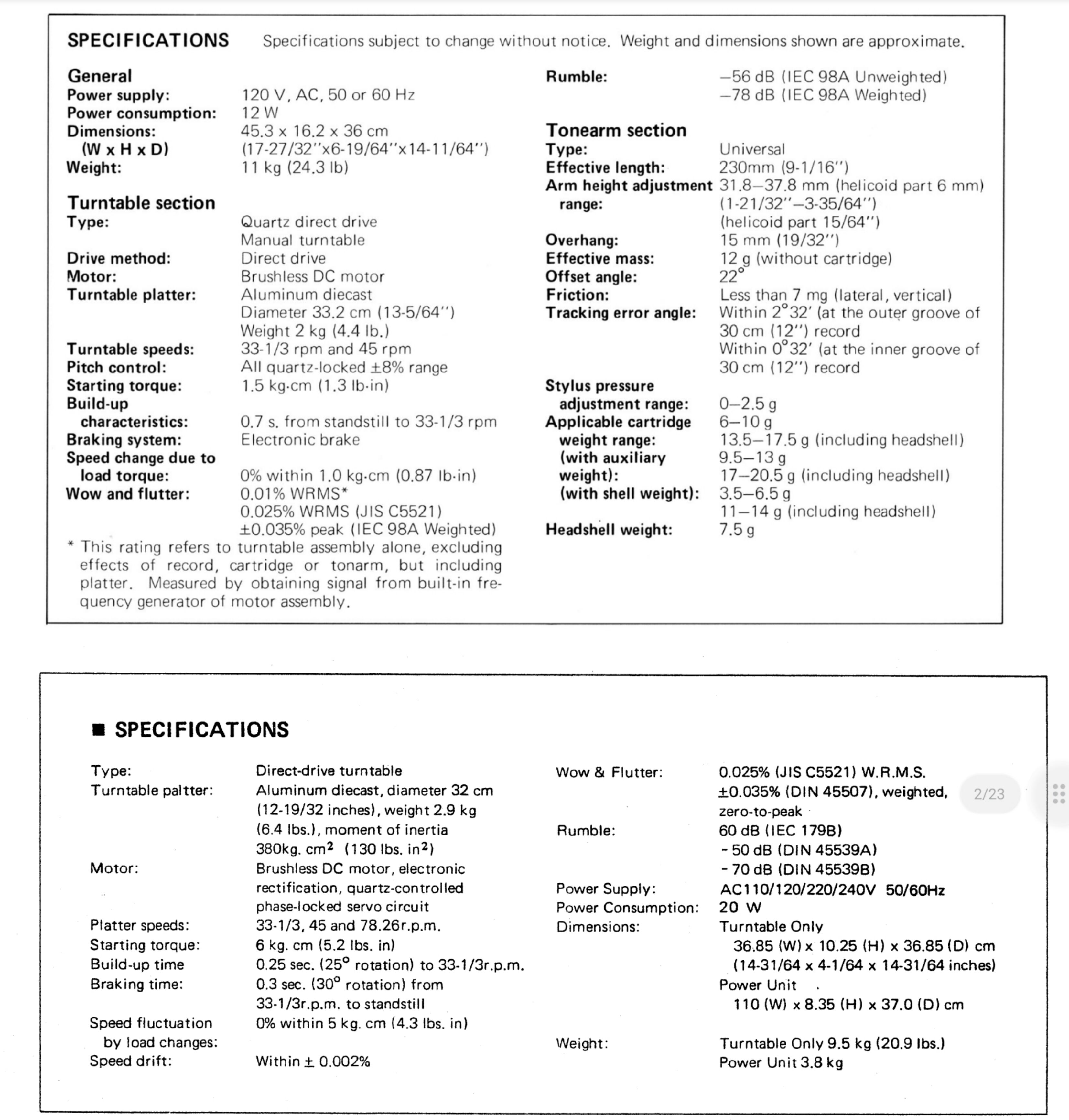 И как завершение сравнения сухие цифры характеристик. Сверху SL-1200 MK2, снизу SP-10MK2.