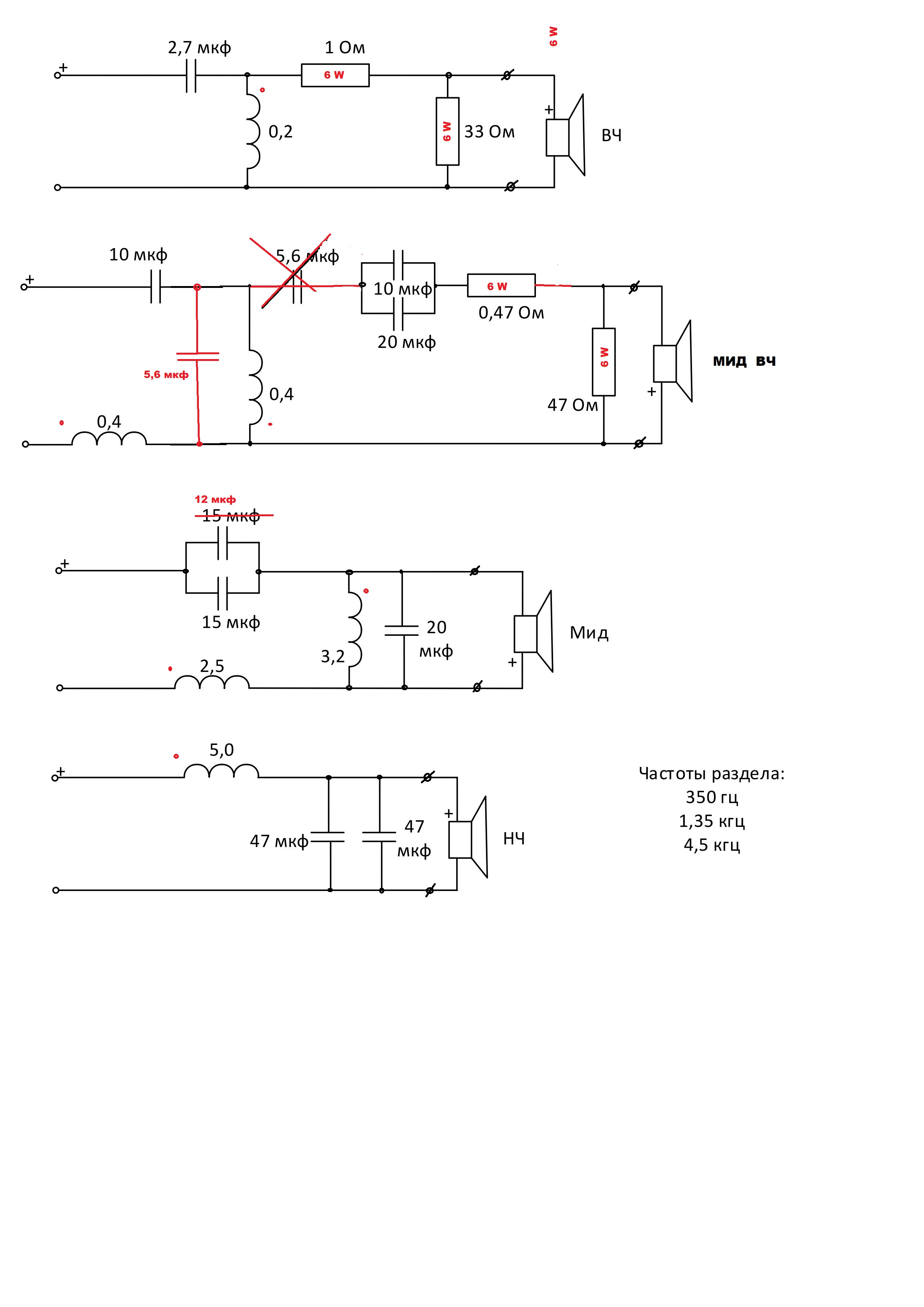 Да, есть ошибка (если у кого возражения - поправьте). Исправления указаны красным цветом. Один номинал конденсаторов в СЧ тоже другой (по крайней мере у меня). Начало катушек указал. Все резисторы 6 ватт. Электролиты биполярные.