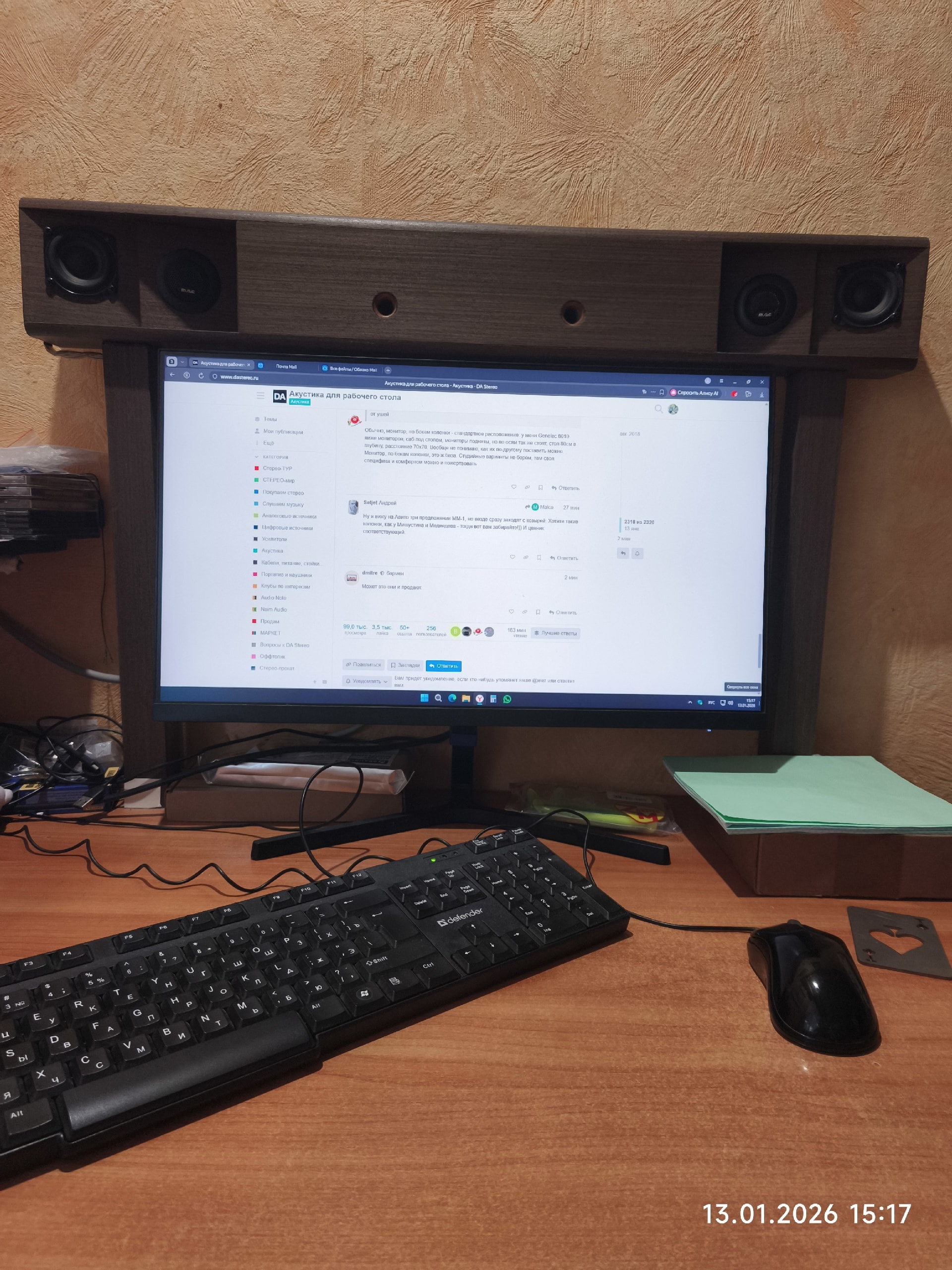 У меня раньше были свены на столе, которые “фонят в эфир” при простое, которые надо было включать и выключать каждый раз, тянуться регулировать громкость и т.д. К тому же прям мало было рабочего пространства, мешались на столе. Недавно придумал создать подобие саундбара из того что было, твитеры из машины, динамики вроде от какого то тв или колонки, динамик 16см на сабовое звено когда-то покупал ради нужной пищалки после “обслуживания” с Авито за 500р. Усилитель с али который отработал в гараже лет 5 теперь встроен в системник и питается от единого БП на 700Вт который с запасом для железа ПК, отдельно какойто усилитель для саба на 30Вт который имеет фильрацию НЧ. Темброблок получает коррекцию и уровень звука с звуковой карты и отправляет сигнал на усилитель и фильтр НЧ. Запускается всё от единой кнопки и так же выключается.