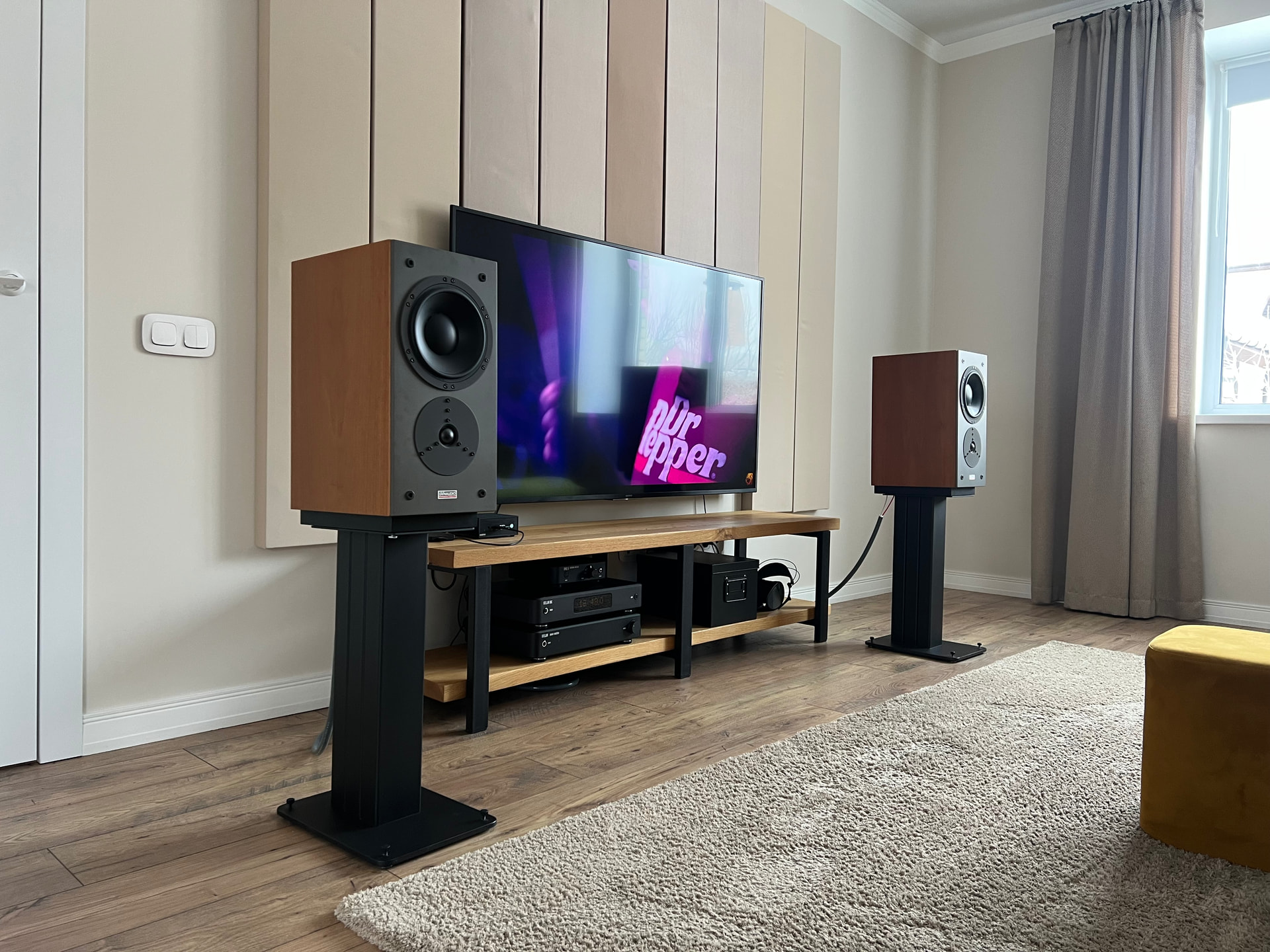 Комната 21м2 с присоединенной кухней, через большой проем 17м2, акустический натяжной потолок калипсо, с минватой под ним, вокруг телевизора панели с наполнением из ХБ плит.