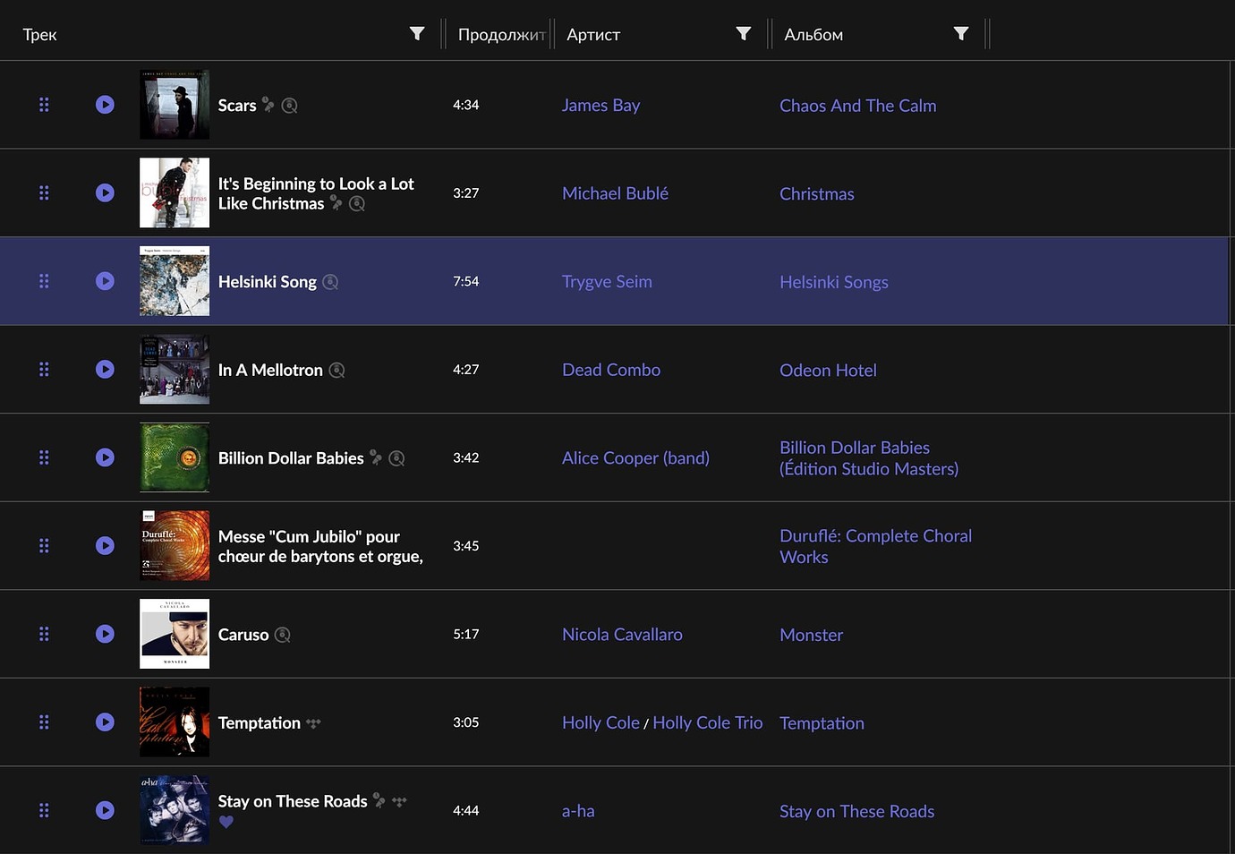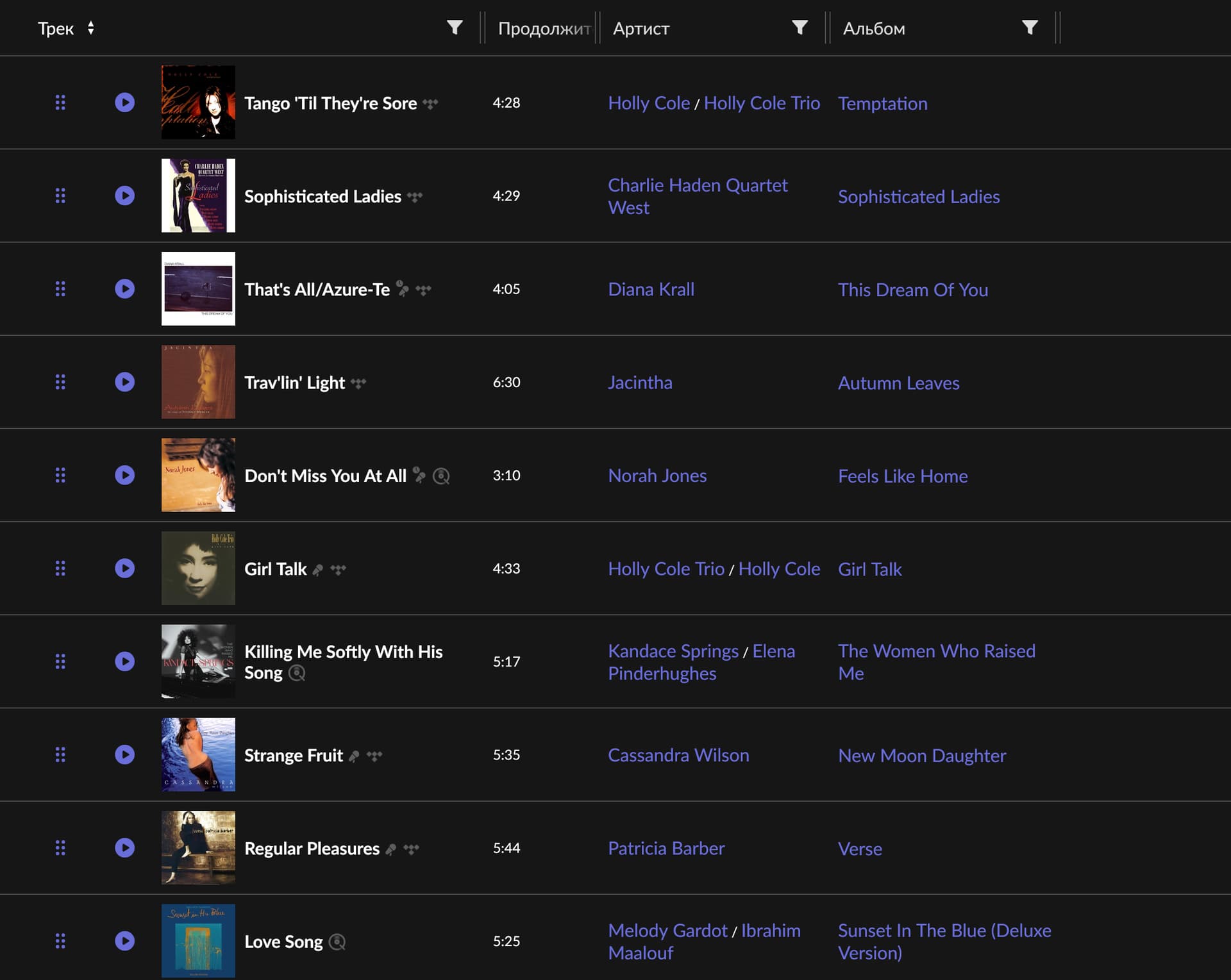 Сегодня Roon предложил новую подборку (плейлист) - ежедневный микс Holly Cole. Это подборка в основном джазовых композиций с женским вокалом. Послушали. Появились новые впечатления и нюансы.