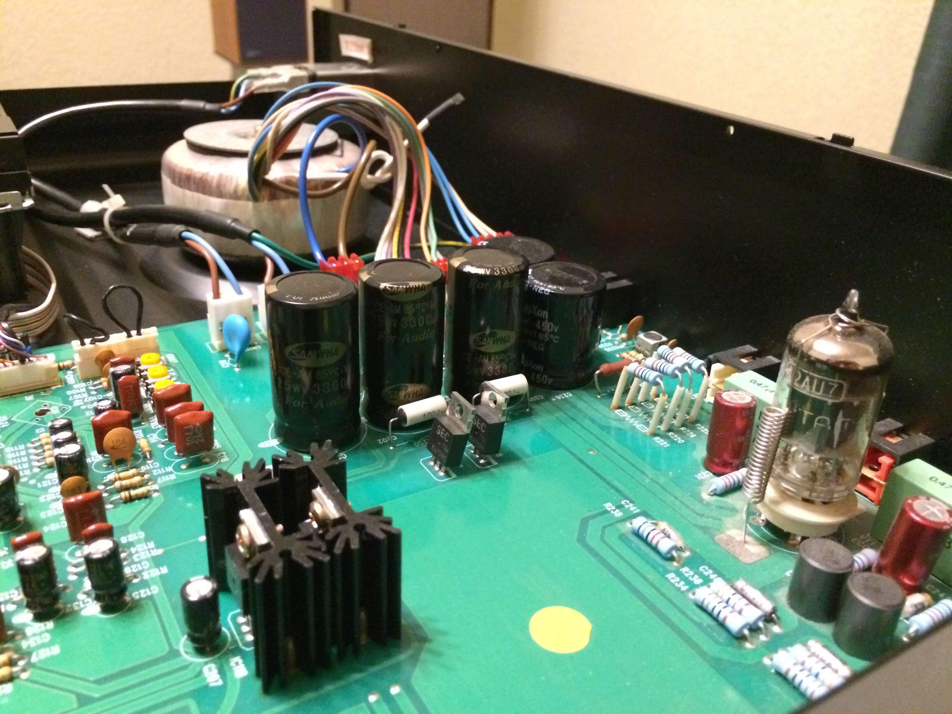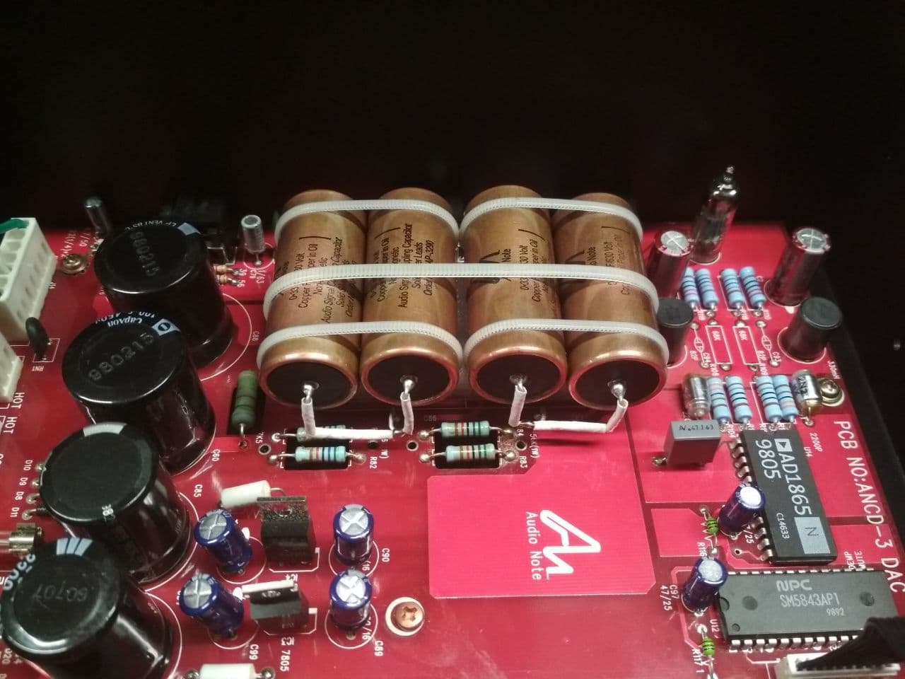 Моя простая красноплатная двойка с батареей РСЗО из медномасляных АН кондеров. Стала теперь заметно жирнее звучать.