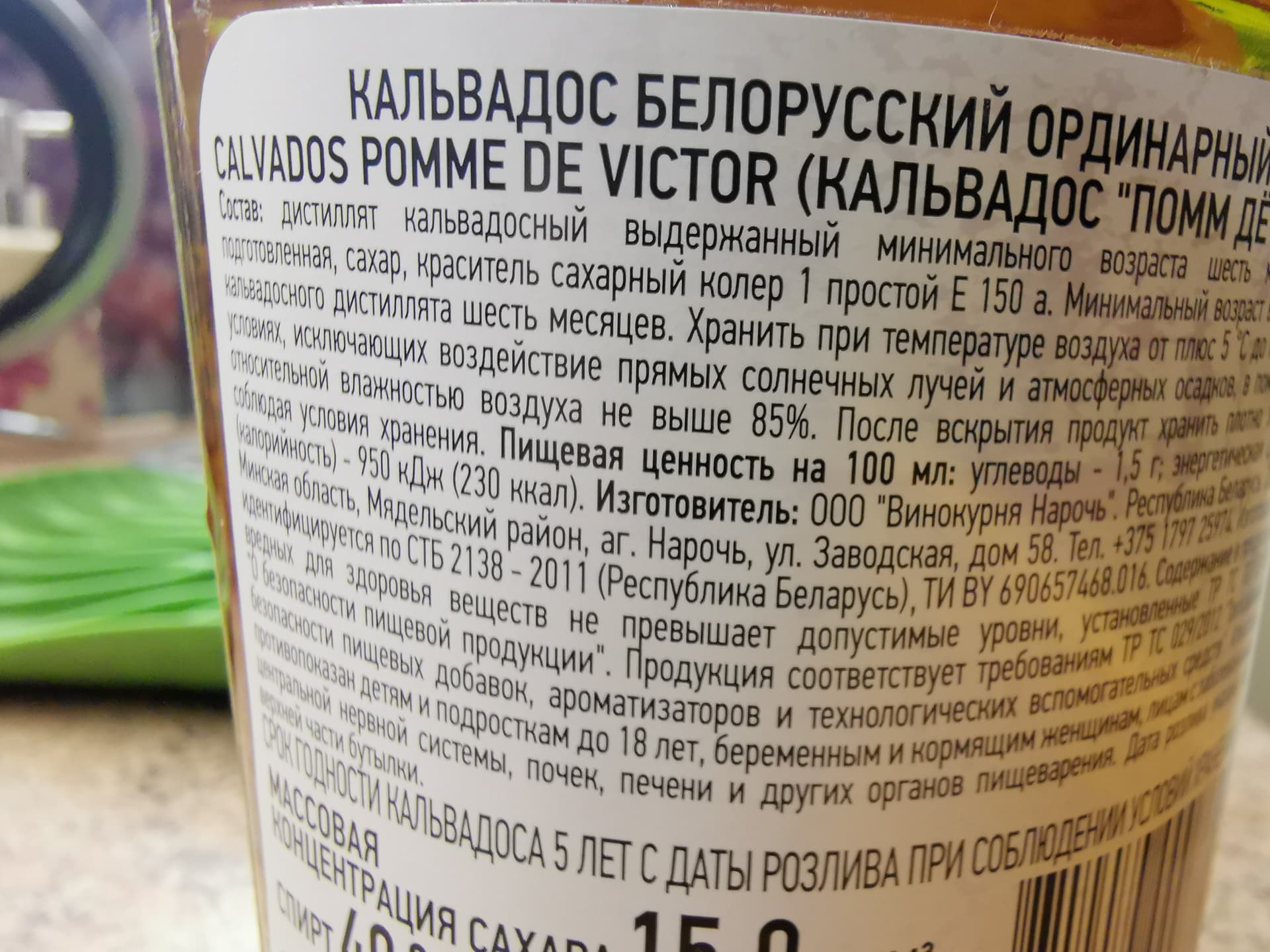 Отведал пару рюмок Кальвадос Винокурня Нарочь Pomme De Victor белорусский , впечатление , очень непонятные …оригинал не пробовал , судить строго не могу , как бренди , нутром понимаю , оригинал значительно отличается от белорусского . Поправьте , может я ошибаюсь .