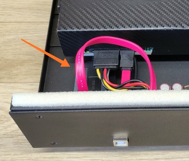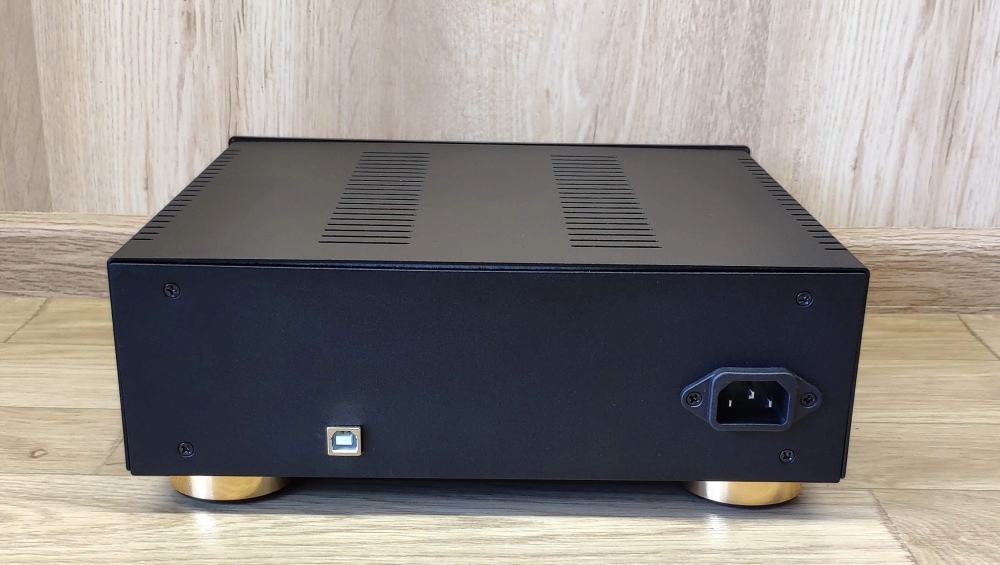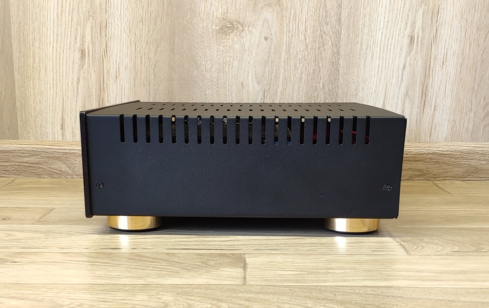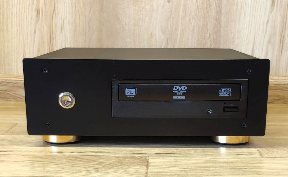 Выполнена виброизоляция, толщиной 3мм, все ребра жесткости залиты резиноподобной мастикой американского производства. Крышка тоже обработана виброизоляцией. Отвод тепла от привода на корпус. Вибродемпфированные ножки. Кнопка включения питания - нержавейка, цвет зеленый. Копрус металл 1,2мм. Порошковая покраска, черный бархат. Передняя панель, алюминий 4мм. Вес устройства - 3,5кг. Размеры 260х250х80мм.