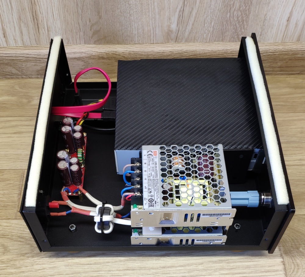 Блоки питания MEAN WELL LRS-35-5 и LRS-35-12. В каждом, заменены электролитические конденсаторы на Nippon-Chemicon, LOW ESR, дополнены пленкой и керамикой, в нужных местах. Выполнен апгрейд термоинтерфейса. На каждое питание, дополнительный, внешний фильтр, для снижения шумов и пульсаций. В качестве привода, доработанный LiteON iHAS124.