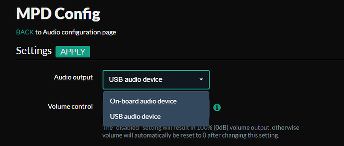 Выше уже ответили:) выбираете просто usb device в mpd конфиге. То что в меню “саунд” с выпадающим списком это для подключаемых по i2s, тоже не сразу сообразил несмотря на подсказку рядом.