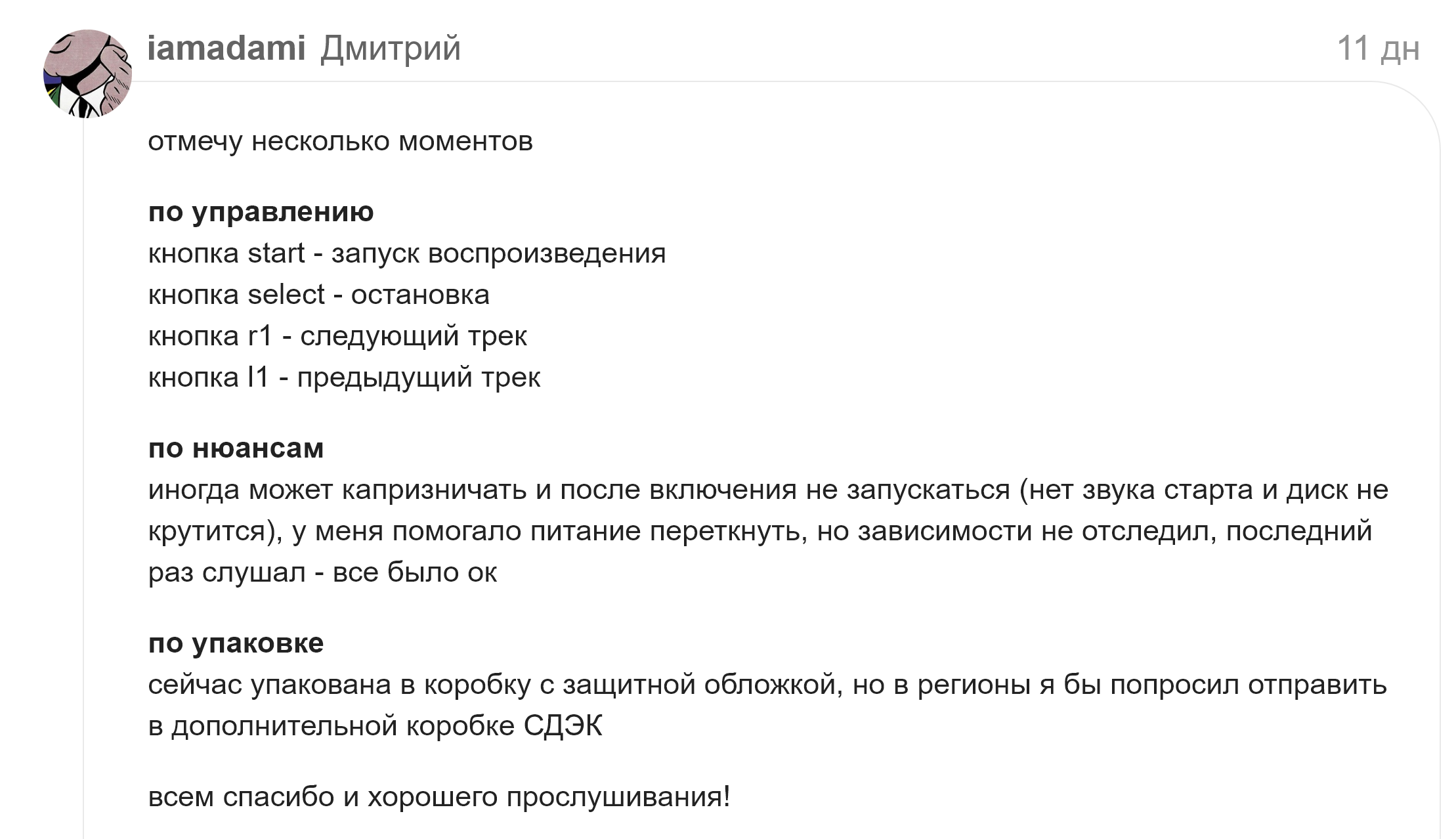 Поставил PSку в систему, зарядил в нее самописанную болванку с Танитой Тикарам - играет ОЧЕНЬ приятно, уже полдиска проиграло, никаких сбоев в чтении. Я такое называю “аналоговая подача звука”. Когда натурально, ненавязчиво, музыкально и можно слушать целыми днями напролёт как магнитофон, а похоже, что это так.