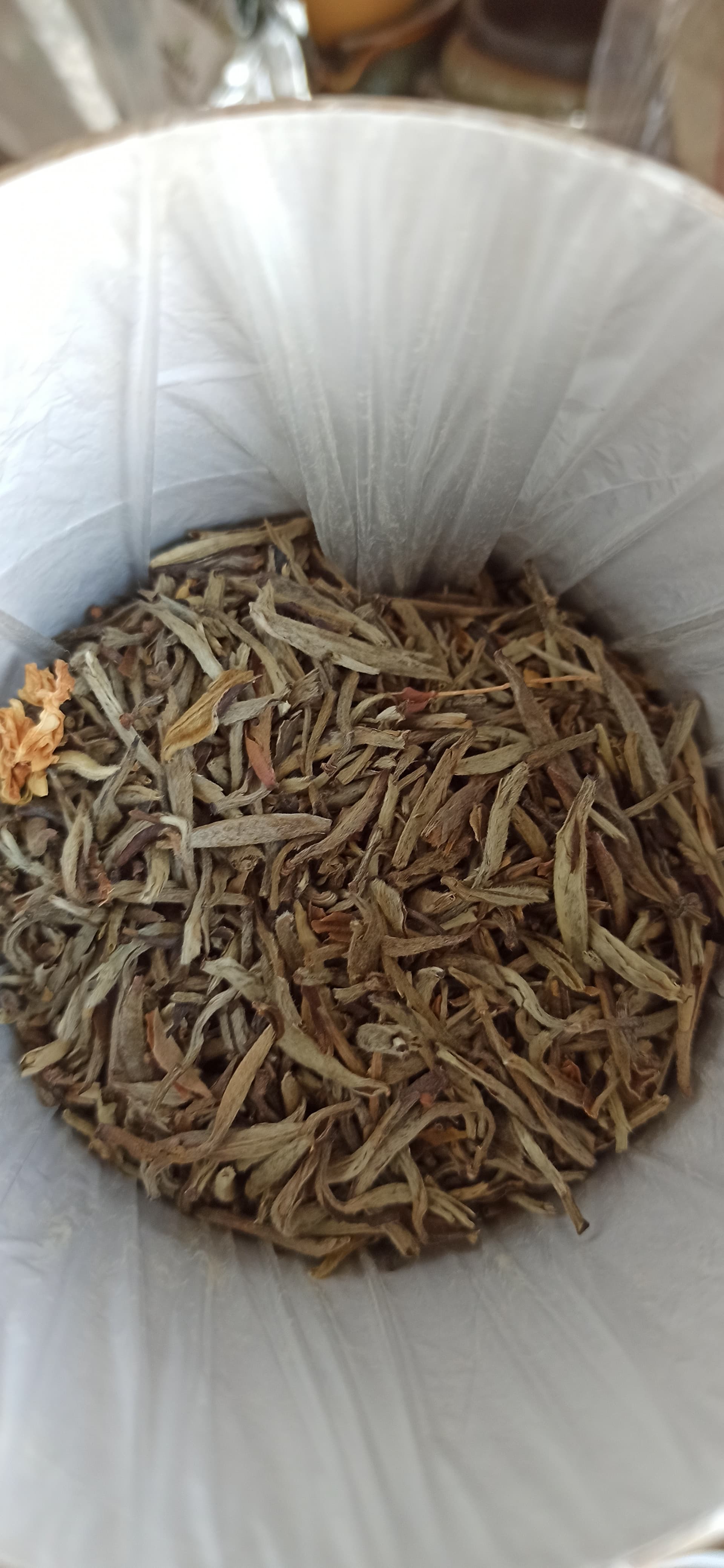 Вообщем, у одного моего поставщика закончился обычный бай Хао и он мне продал пол кило Моли Бай Хао Инь Чжень. Это тот же бай Хао, но с жасмином. Я к жасмину так себе. В данном случае очень перебил основной вкус и от бай Хао осталось только состояние и надо сказать, что состояние очень и очень даже, в этой компоненте чай не потерял.