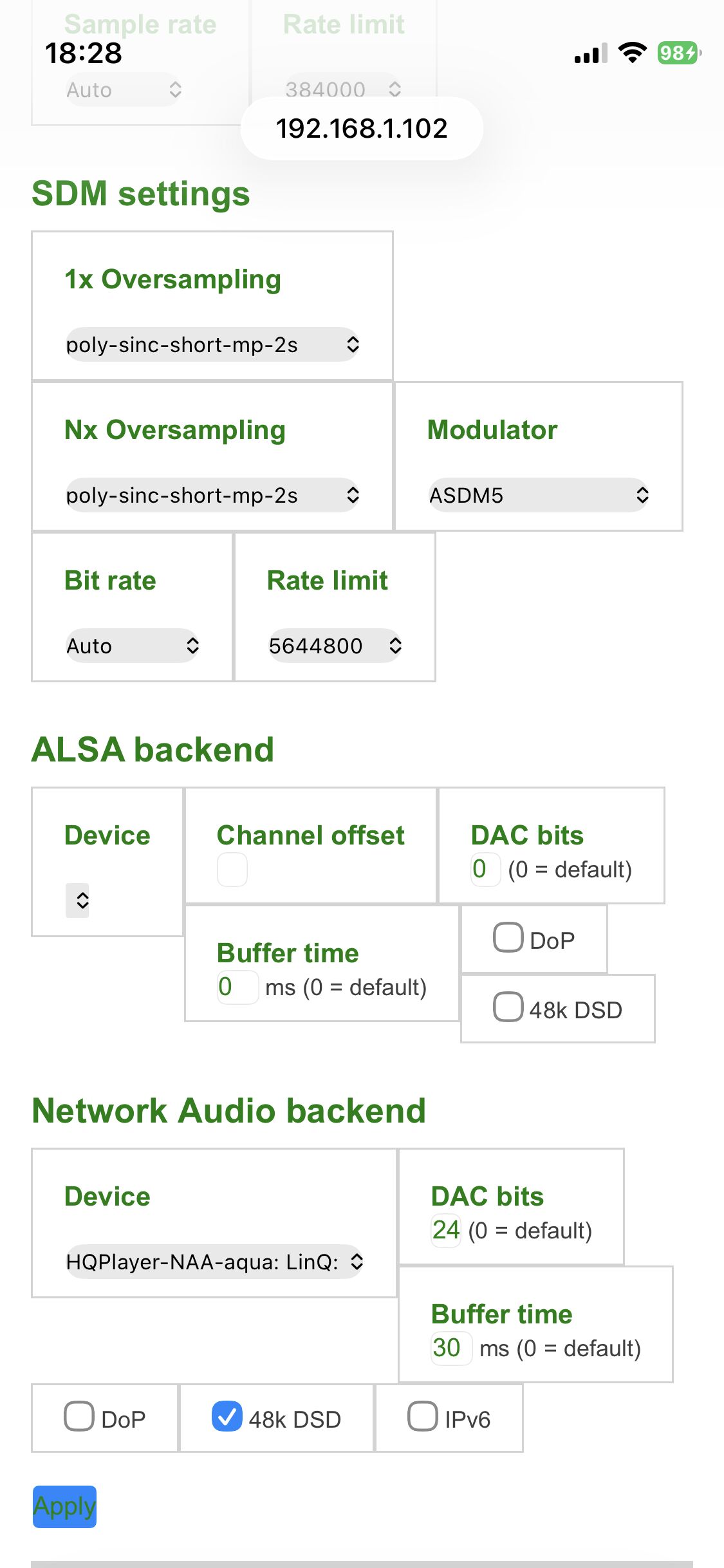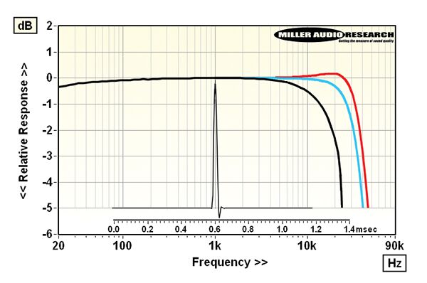 Субъективно, эта проблема более заметна при низких частотах дискретизации (44,1 кГц/48 кГц) [см. отчёт о лабораторной работе PM] , где частотная характеристика также проседает в области высоких частот от –0,7 дБ/10 кГц до –2,3 дБ/20 кГц [чёрная кривая, вставка на графике]. Более высокие частоты дискретизации вытесняют наложение спектров на более высокие частоты, что хорошо, – где характеристика простирается до –0,3 дБ/20 кГц и –7,0 дБ/45 кГц для файлов 96 кГц [синяя кривая] и +0,2 дБ/20 кГц, –4,5 дБ/45 кГц и –21 дБ/90 кГц для файлов 192 кГц [красная кривая]. PM
