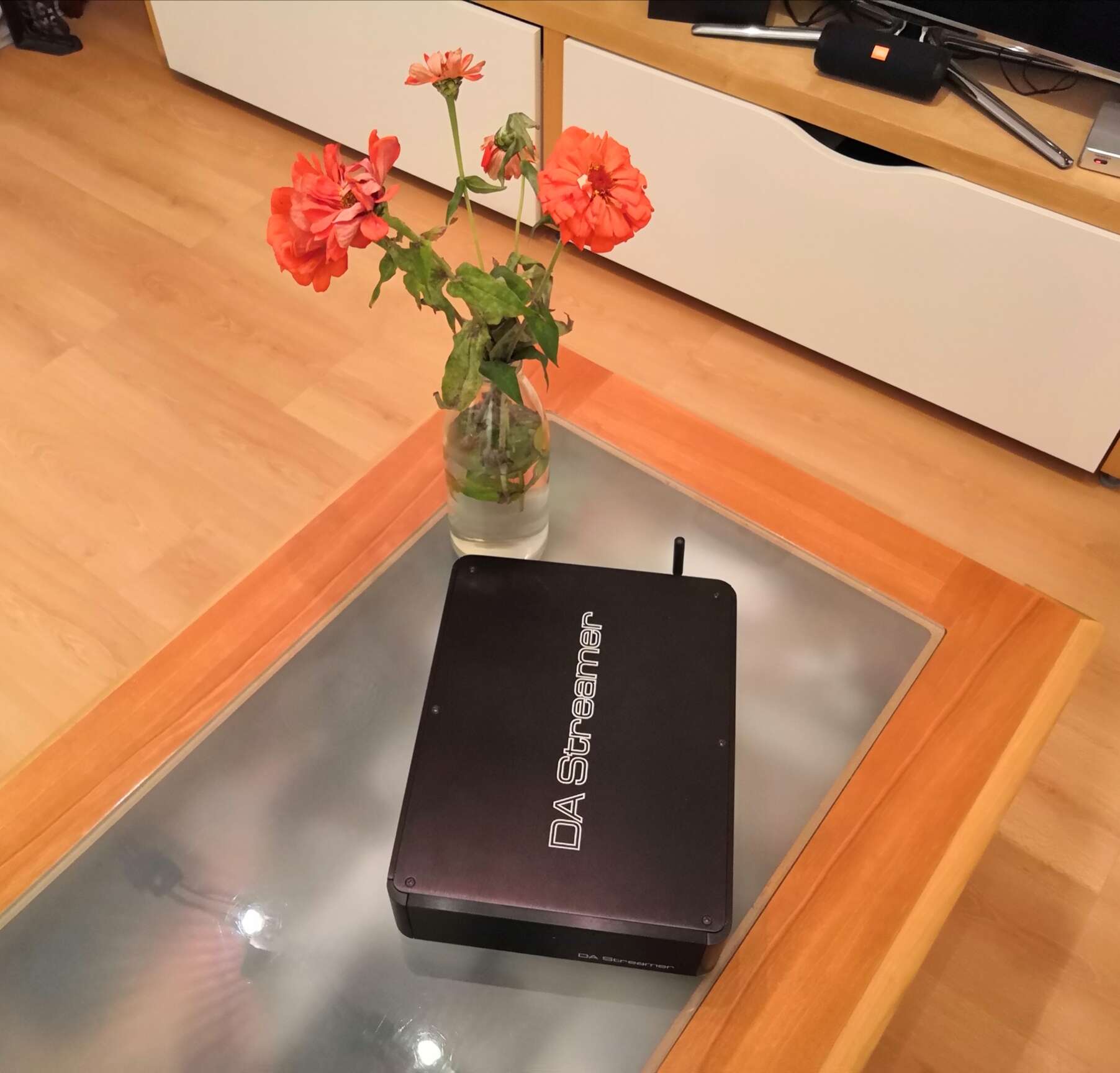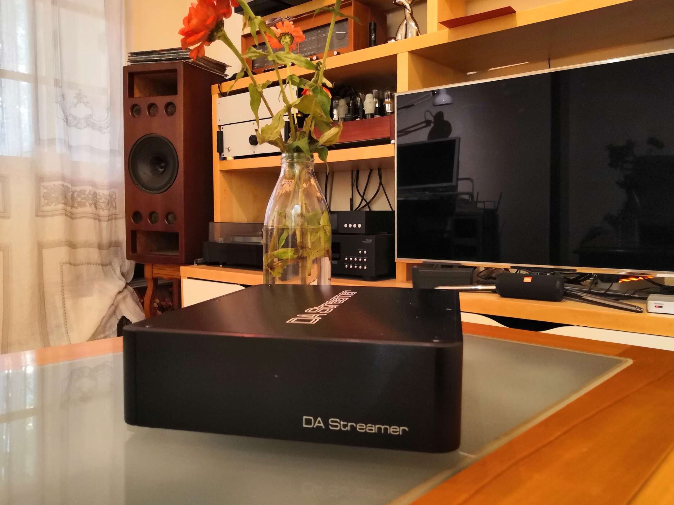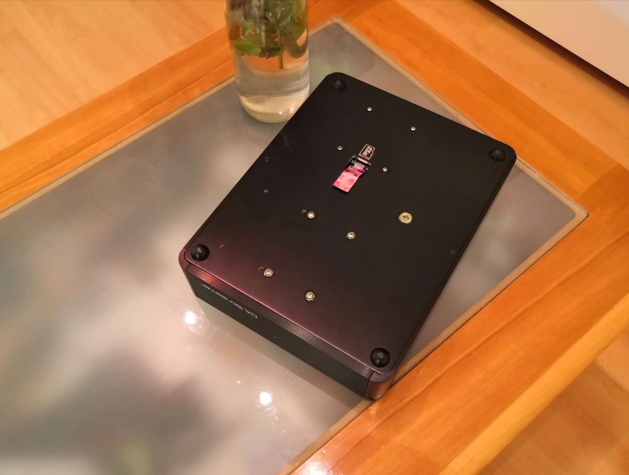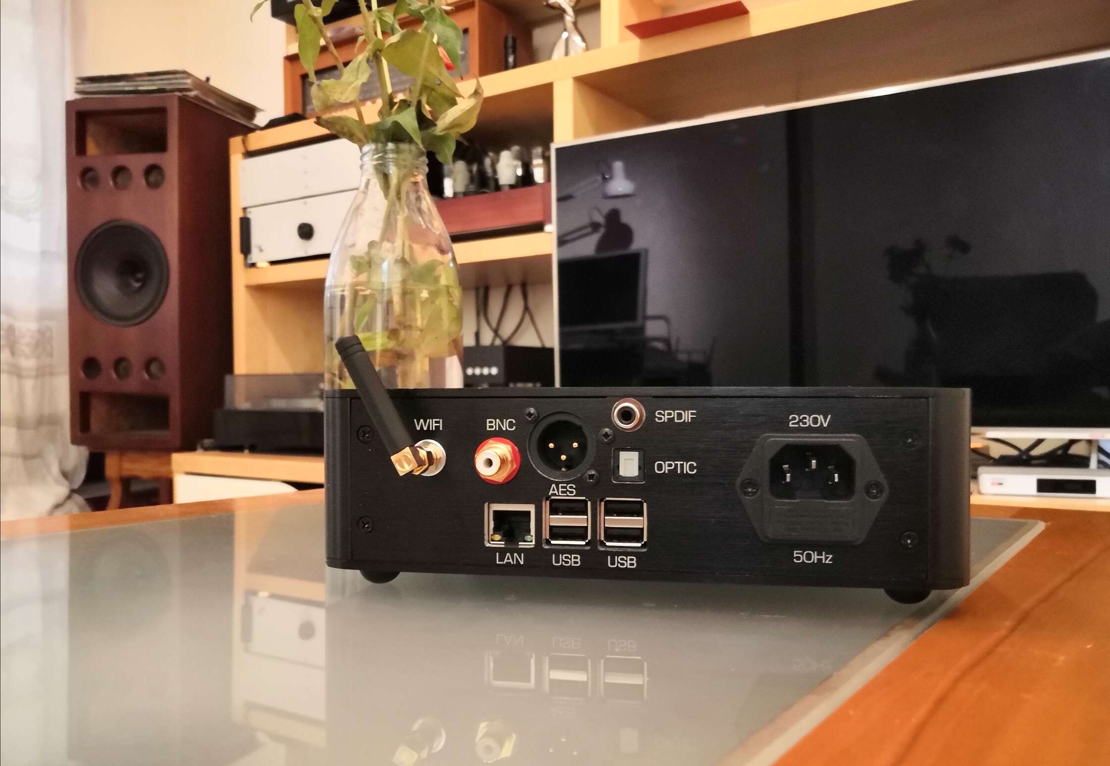 Устройство оказалось довольно увесистой небольшой (примерно с айпэд) коробочкой, по форме напоминающей одновременно Soundaware D100 и Denafrips Pontus, и украшенной фирменным логотипом набирающей популярность компании.