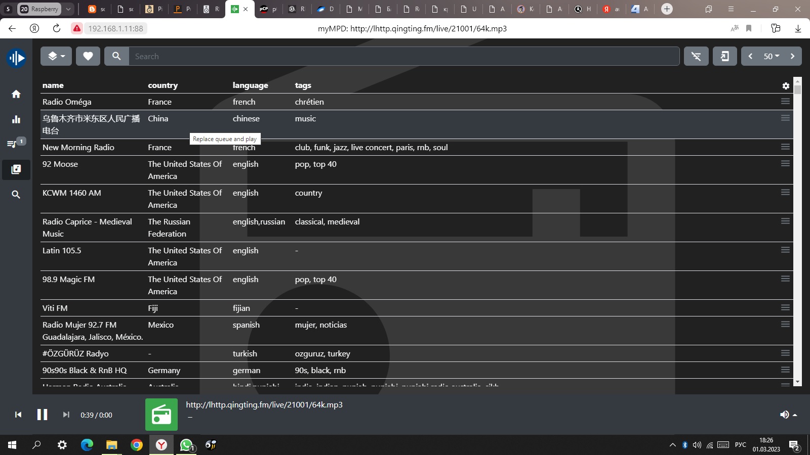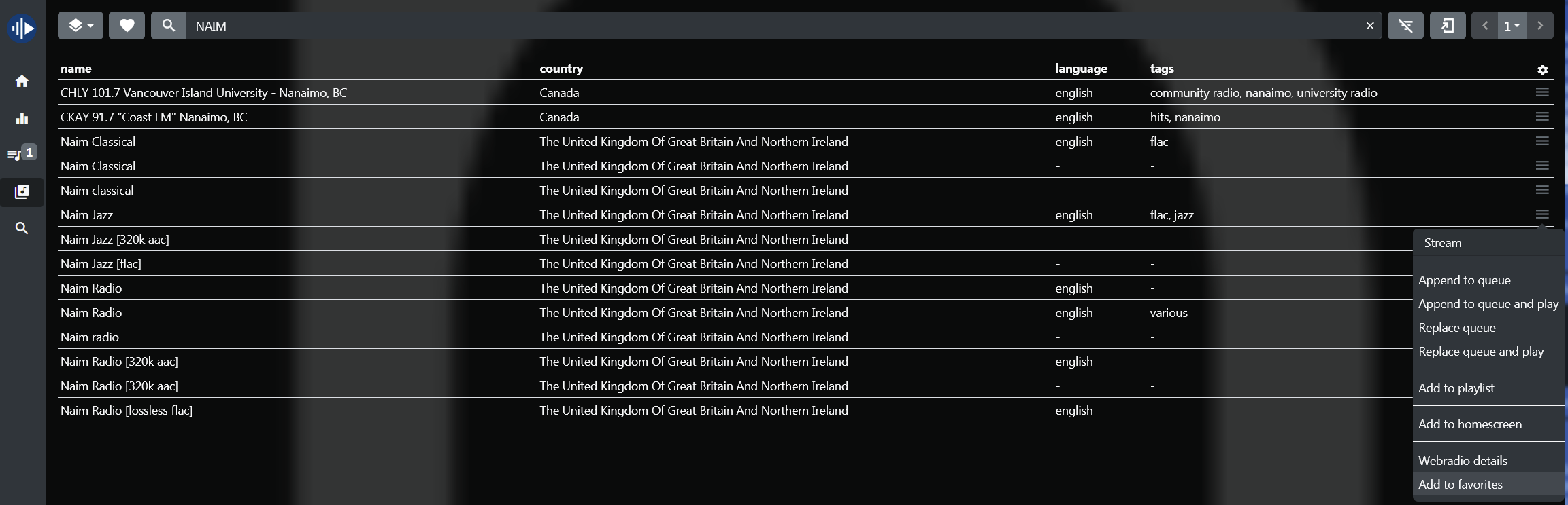 А ещё в mympd есть встроенный поиск по сайту , можно искать по стране, тэгам, языку станции. Вполне удобно, надо сказать, в 10 раз удобнее, чем вручную шариться по сайтам. Справа видите на скриншоте перечёркнутые три полоски? Нажмите, появится поиск по стране/языку/тэгу