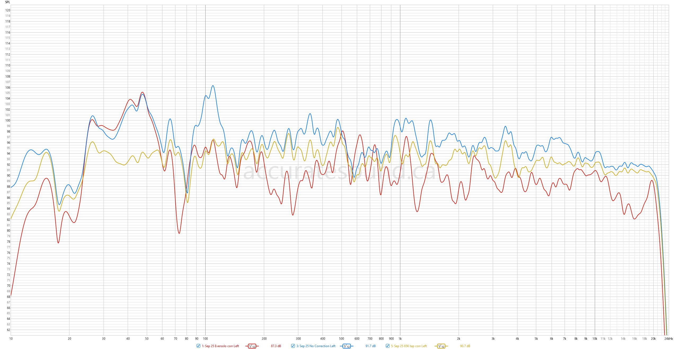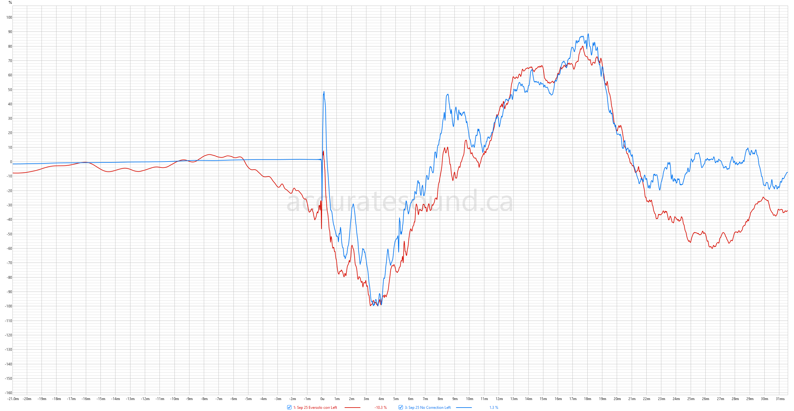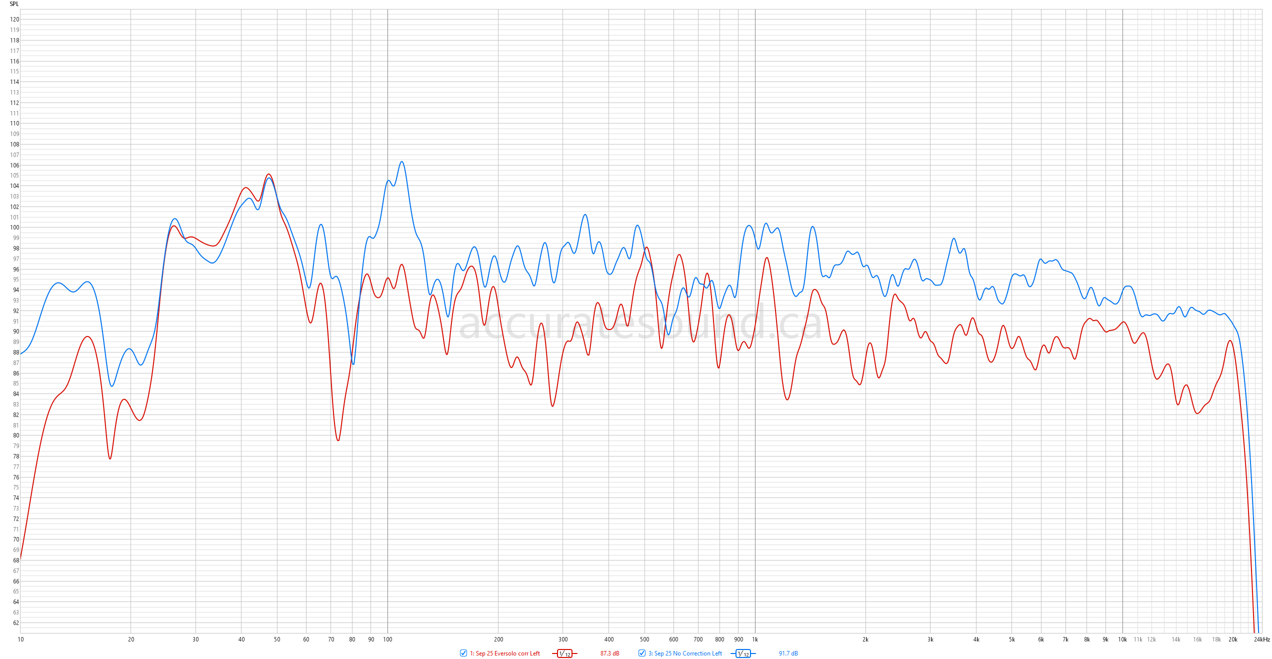 Красный график — это коррекция Eversolo, а синий — исходная (без коррекции) характеристика акустической системы. За исключением (синего) пика на частоте 110 Гц, характеристика акустической системы более ровная, чем с Eversolo DRC.