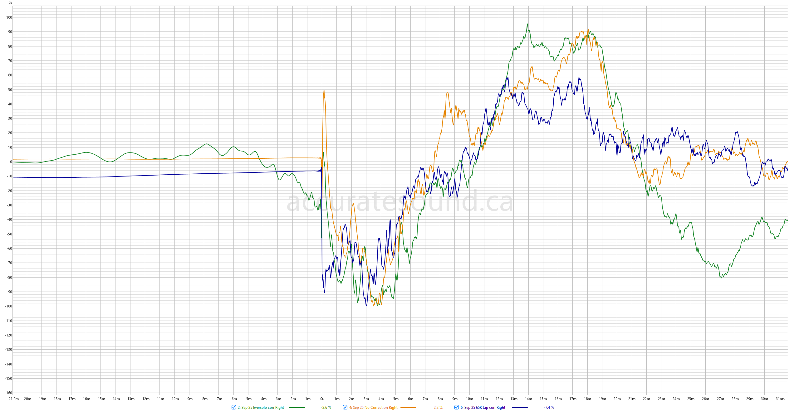 Теперь правый канал. Зелёный — это Eversolo DRC, золотой — необработанные измерения, а синий — фильтр Audiolense 65k, что говорит само за себя. В правом канале Eversolo наблюдаются те же проблемы, что и в левом канале выше.