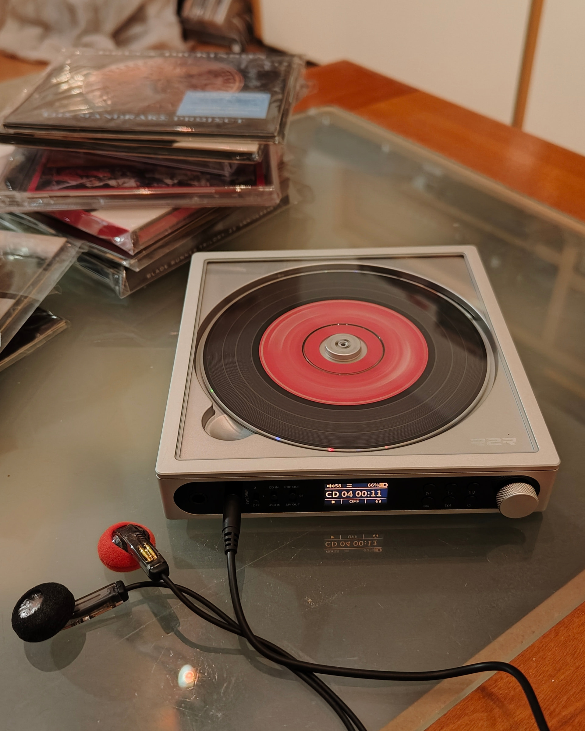 Начну с того, что я не наушниковый, а колоночный человек, так что основные впечатления – по работе в качестве стационарного проигрывателя в аудиосистеме. Меня плейер изначально заинтересовал как возможность снова попробовать воспроизводить сверкающие кружочки, которых у меня довольно много, а слушал я их последний раз лет десять назад и проигрывателя у меня сейчас нет (когда-то это был Oppo BDP-105D).