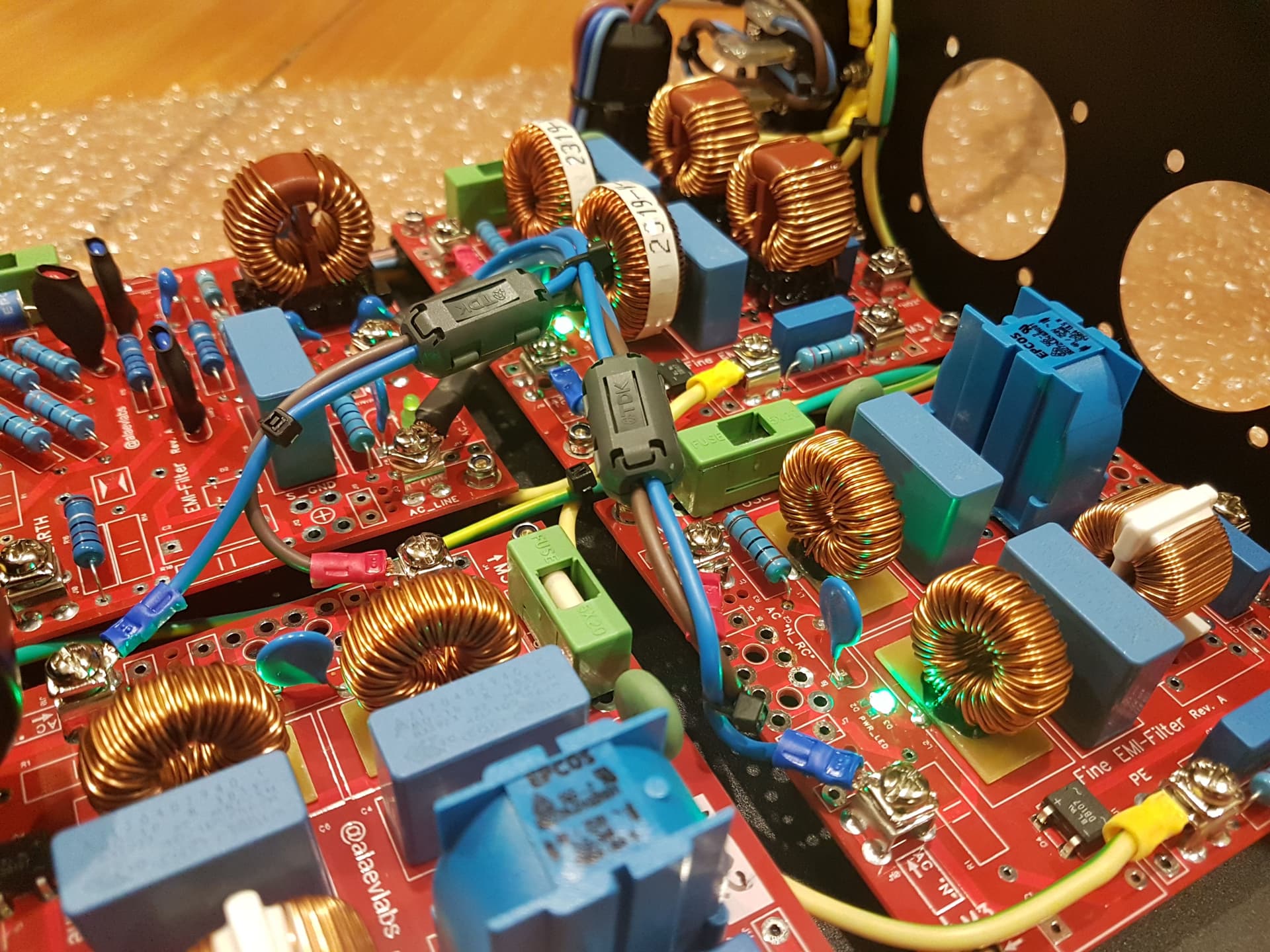 Страсти накаляются. Работа подходит к концу. На данный момент новый фильтр сетевого питания полностью собран в части внутренней электроники. Остался последний штрих - монтаж выходных розеток. Пока этого не произошло, сделал несколько фотографий внутренней сборки устройства.