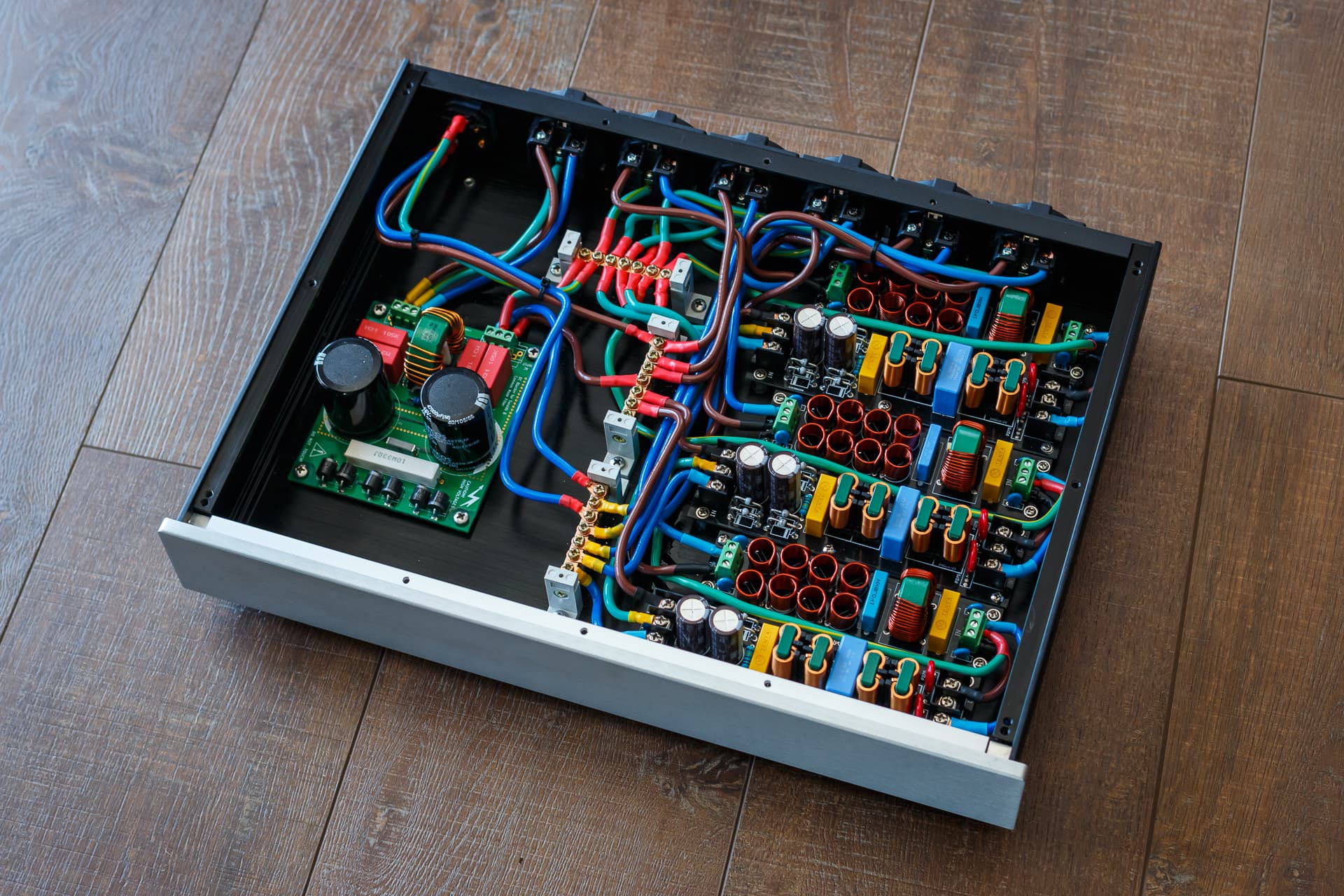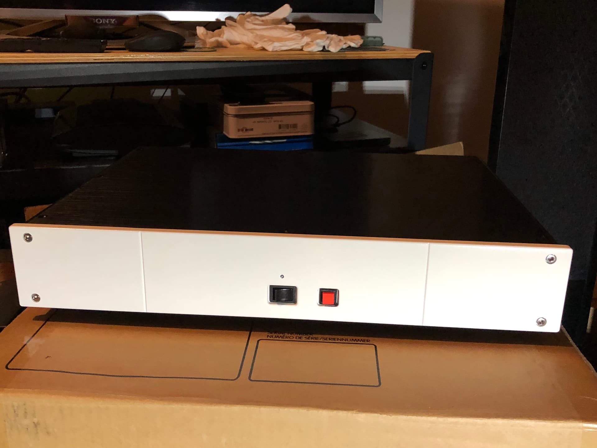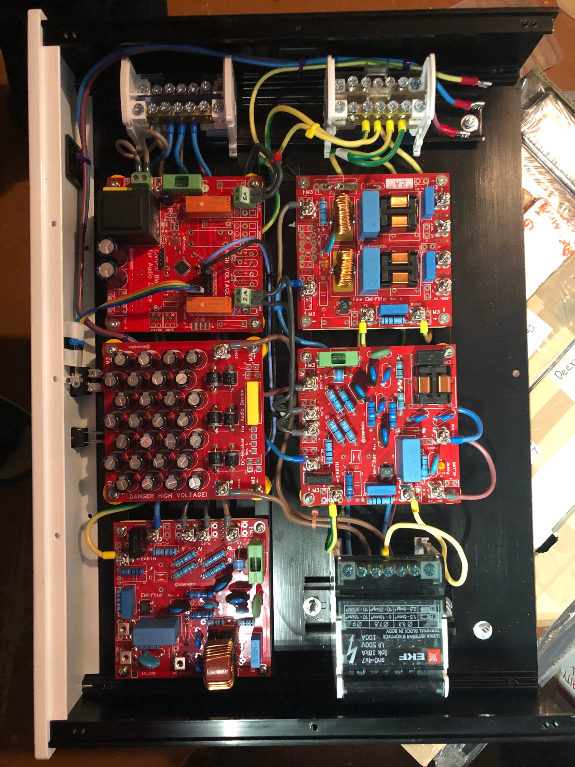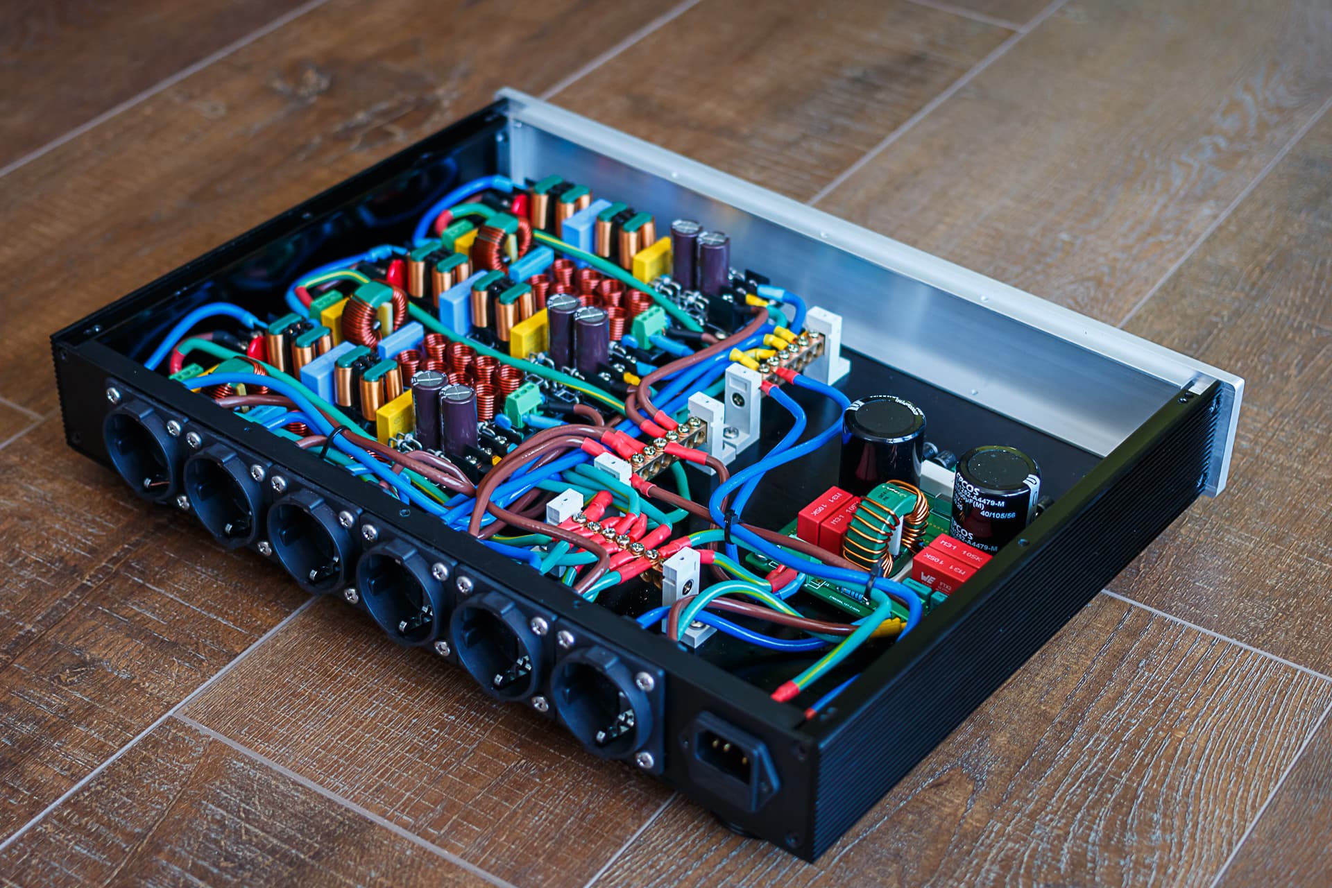 Закончил сборку своего фильтра-распределителя питания на основе готовых плат. Вчера подключил к системе и пару часов отслушал. Результат мне очень нравится. Главной целью проекта была ликвидация гула тороидального трансформатора усилителя, который изрядно портил удовольствие от прослушивания музыки, да и просто шумовой фон в комнате. Ситуацию усугубляло то, что по рекомендации производителя усилителя для достижения оптимального качества звука он должен всегда находиться во включеном состоянии, и надо сказать это были не пустые слова. Звучание явно улучшалось через пару часов после включения. С фильтром гул полностью ушел, мало того, звучание заметно прибавило в плане микродинамики и трехмерности. Самое удивительное, что наиболее благотворное влияние фильтрация питания оказала не на усилитель, как я ожидал,а на ЦАП, который я теперь просто не узнаю. Раньше он оказывается звучал довольно гулко, в чем я винил акустику помещения и так же меня раздражала некоторая неестественность на вокале, и ненужный акцент на верхах. Не знаю что в итоге получится после прогрева, но сейчас эти недостатки если не сошли на нет, то явно уменьшились. Правда я попутно еще и сетевой кабель заменил, может он тоже внес свою лепту. Хочу поблагодарить уважаемого Яна за крайне ценные советы касательно разводки земли и замены конденсаторов и Андрея Audiores за идеи и консультации в личных сообщениях. Я к сожалению не специалист по электрике, и после общения у меня появилась уверенность в удачном окончании проекта. В итоге изначальный вариант претерпел значительные изменения, уверен, что в лучшую сторону. Выложу пару фоток фильтра без крышки и подключенного к системе. По моему неплохо сочетается с усилителем! Жаль что он чуть меньше по ширине. Следующим проектом будет изготовление стойки под аппаратуру. Компоненты будут разнесены по высоте, и разница в ширине корпусов надеюсь будет не так заметна.