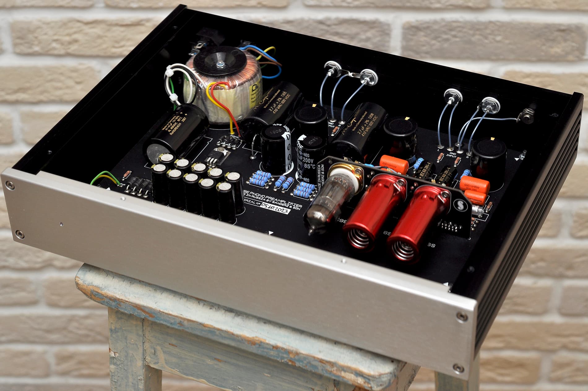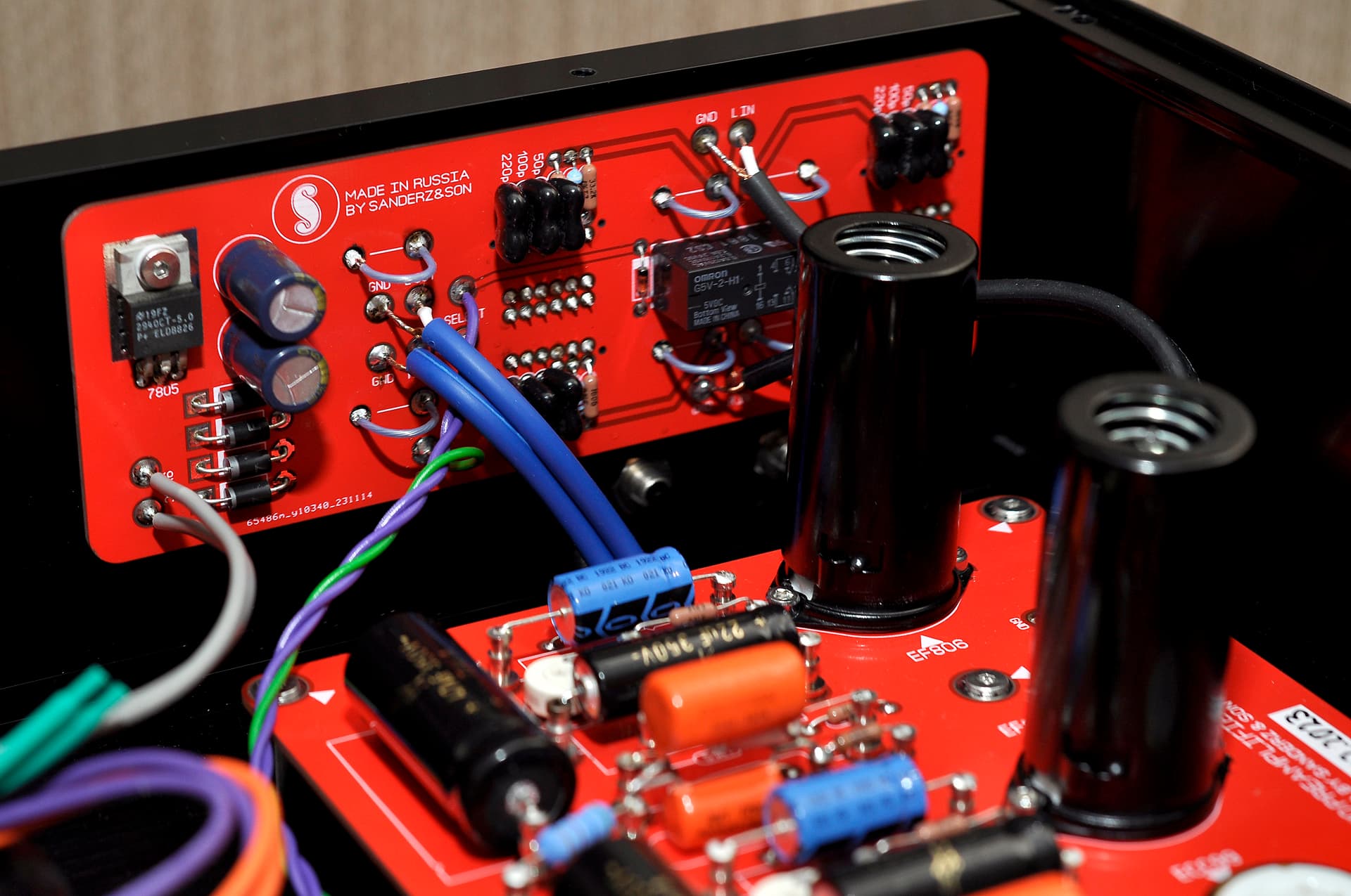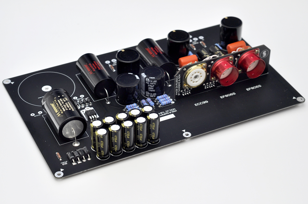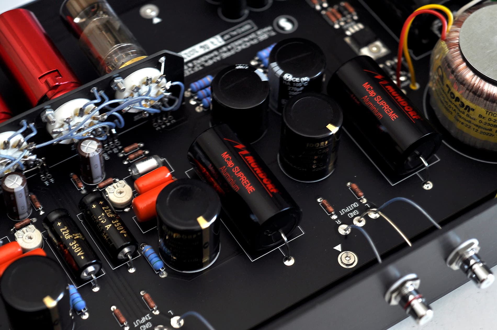 Изготовлен вручную, с использованием только высококачественных комплектующих, таких, как конденсаторы Mundorf Supreme, Mundorf M-Lytic HV, Orange Drop, F&T, резисторы Vishay DALE 1%.