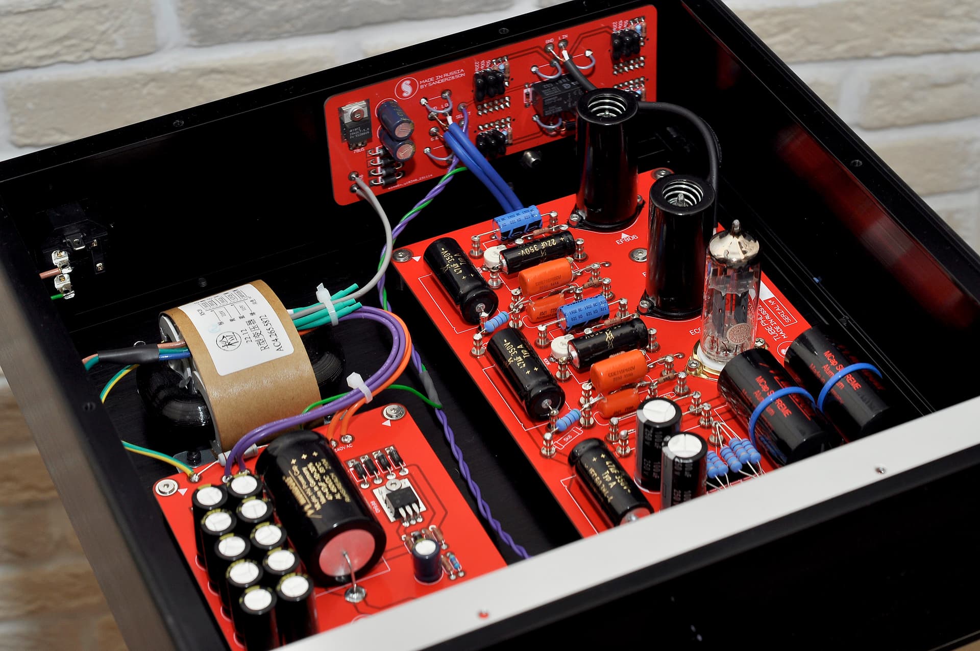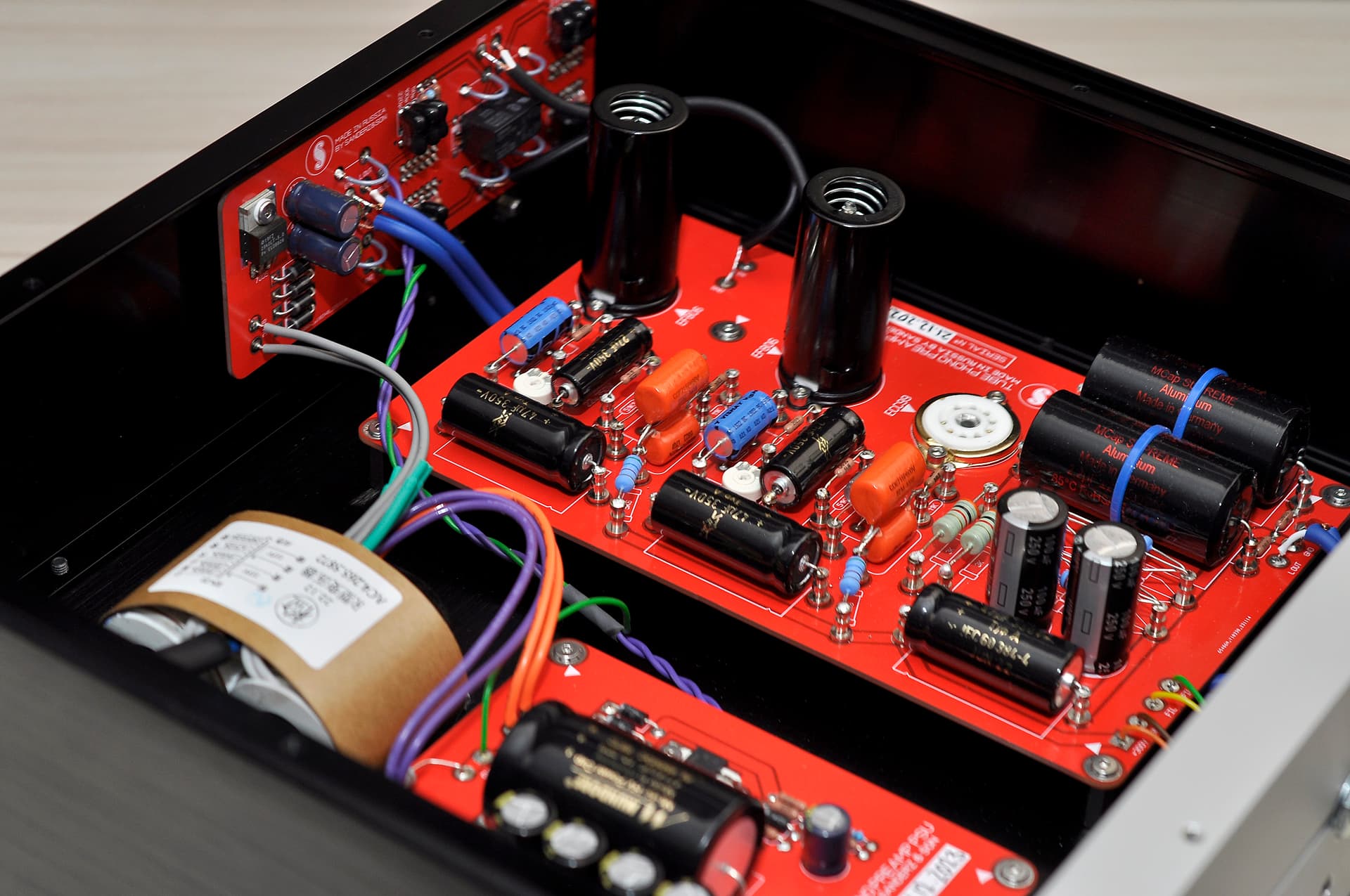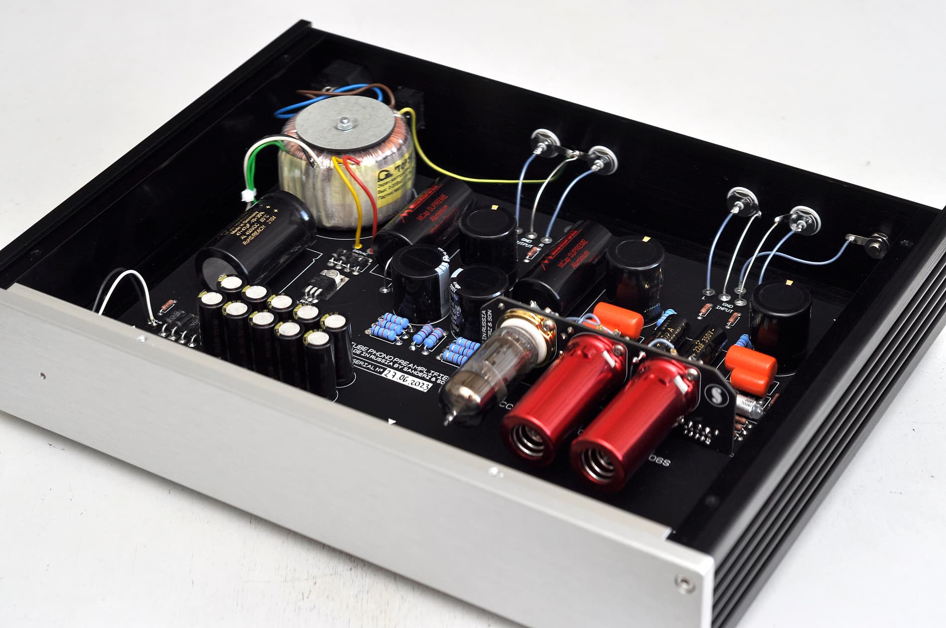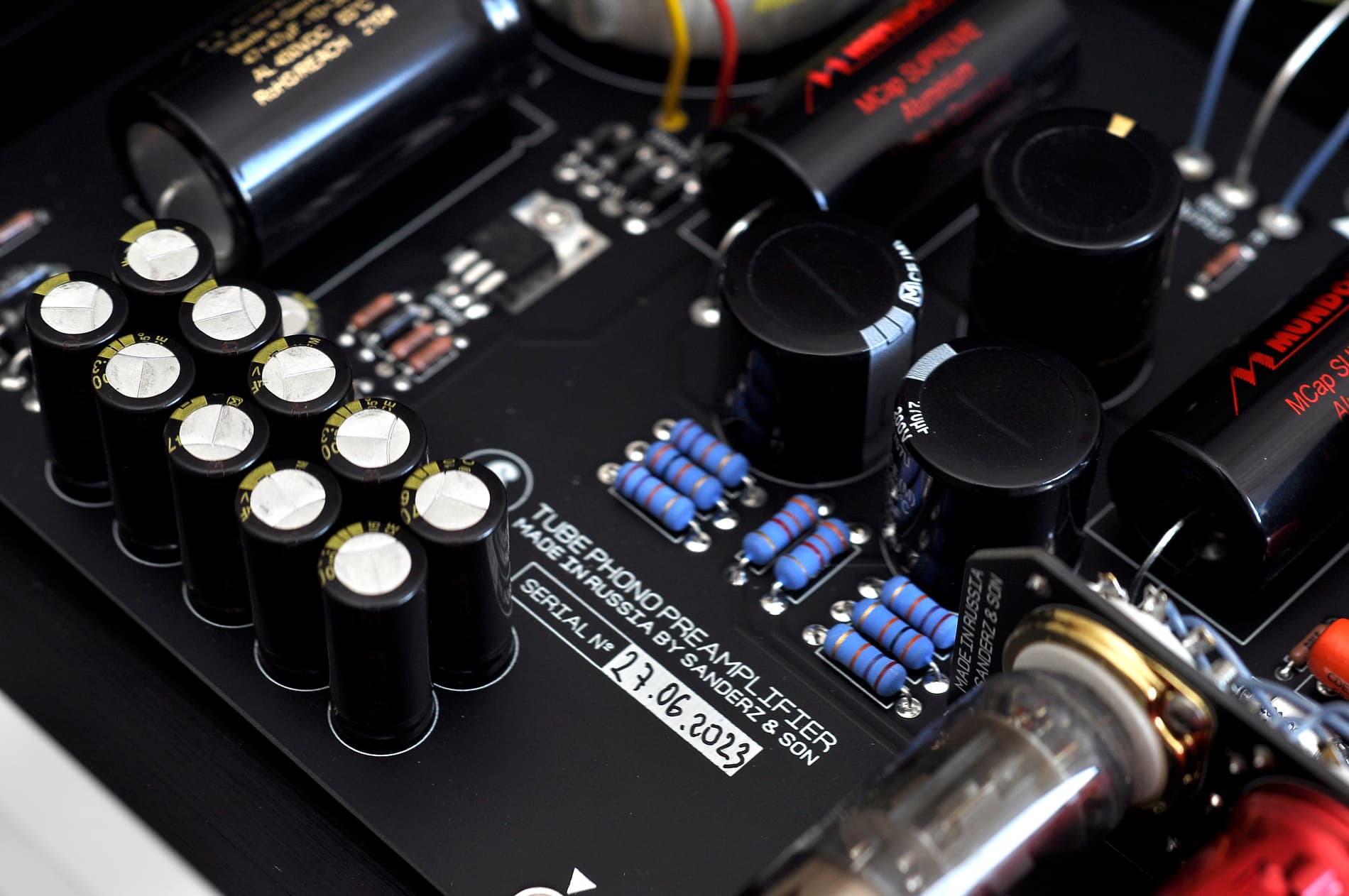 Изготовлен вручную, с использованием только высококачественных комплектующих, таких, как конденсаторы Mundorf Supreme, Mundorf M-Lytic HV, Orange Drop, F&T, резисторы Vishay DALE 1%.