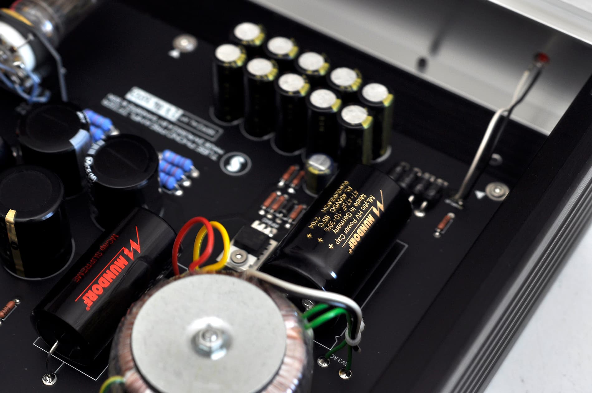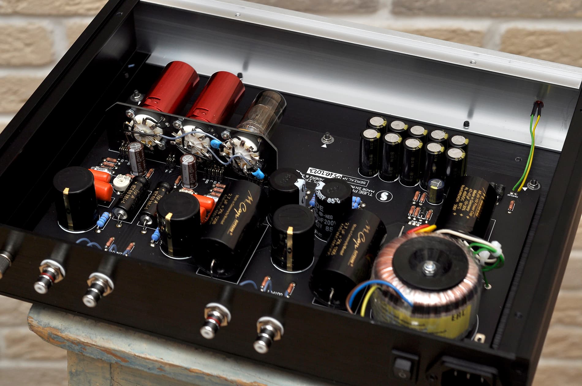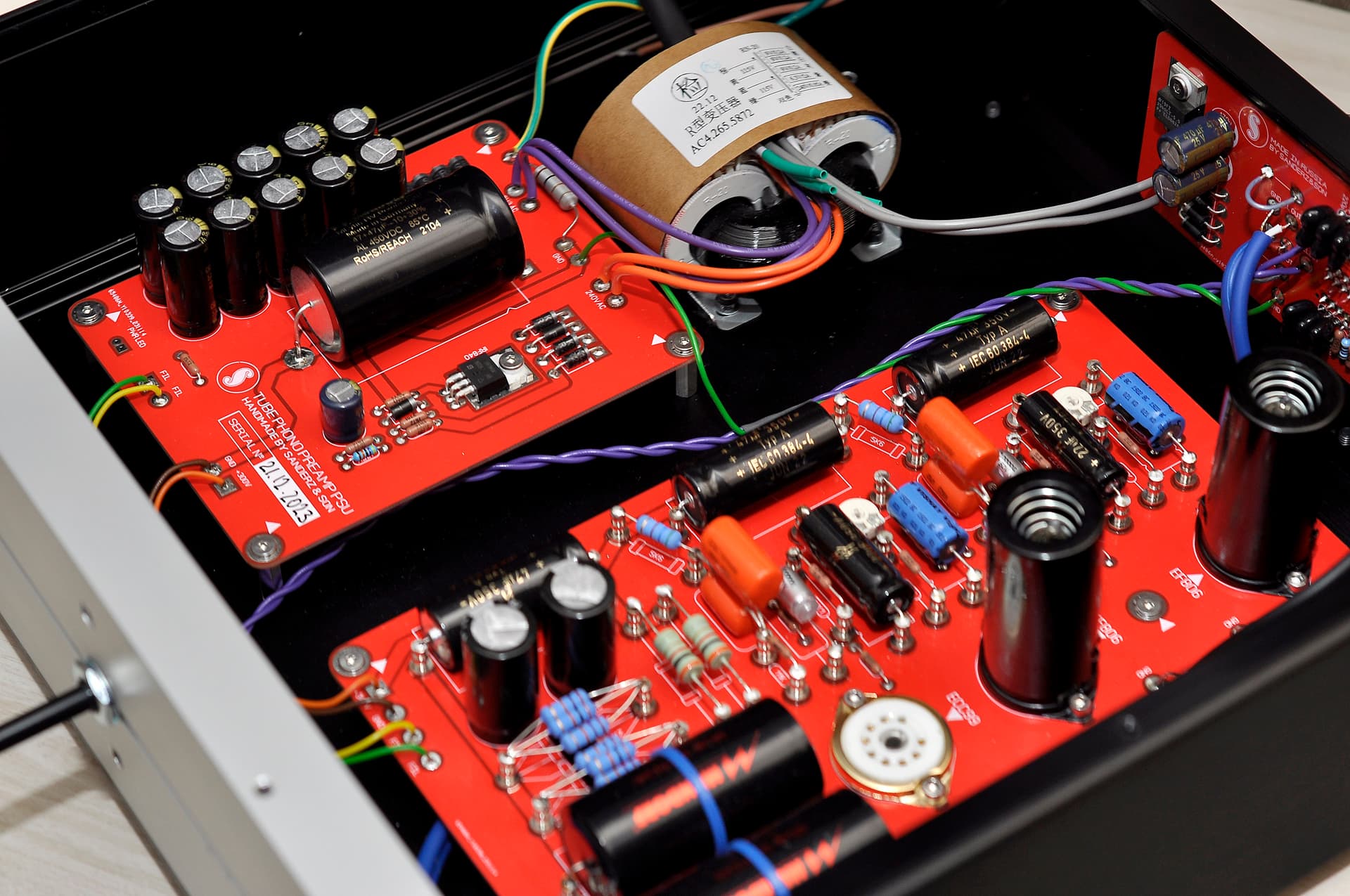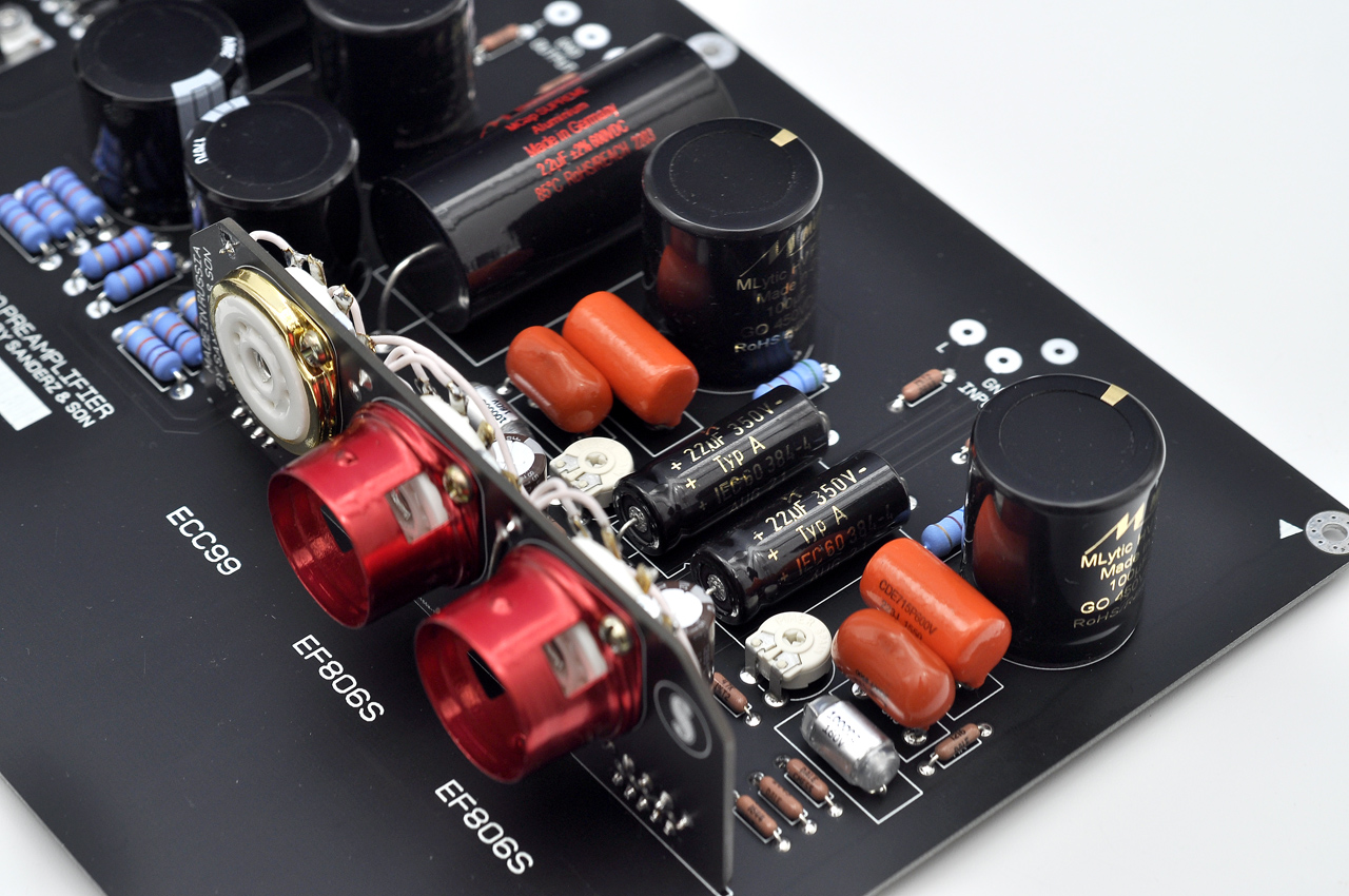 Изготовлен вручную, с использованием только высококачественных комплектующих, таких, как конденсаторы Mundorf Supreme, Mundorf M-Lytic HV, Orange Drop, F&T, резисторы Vishay DALE 1%.