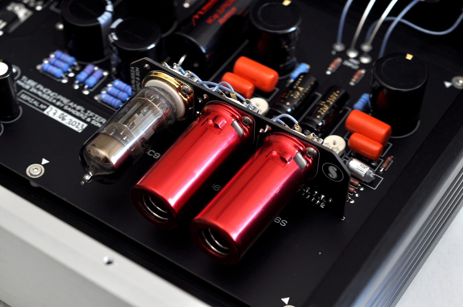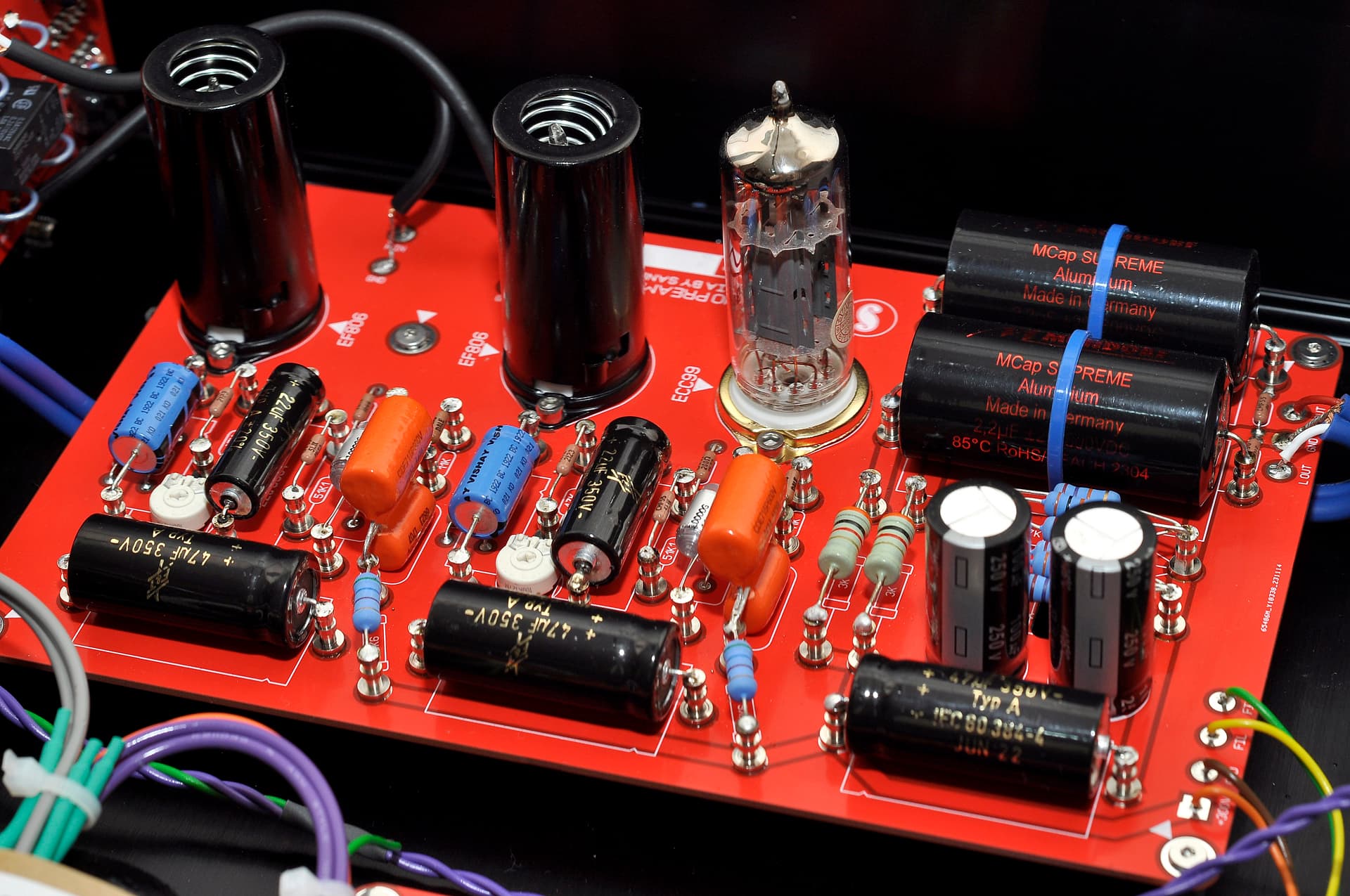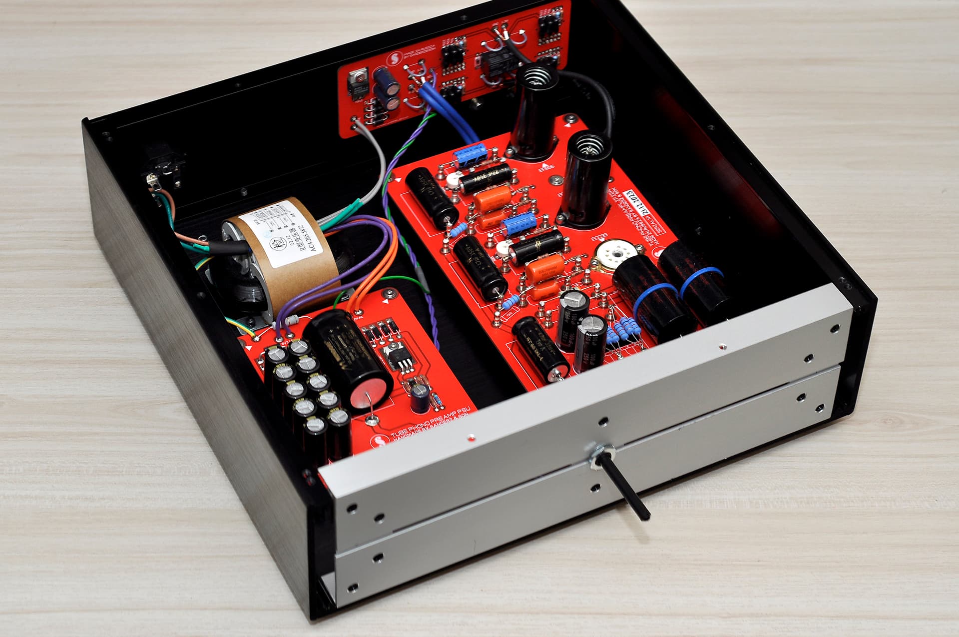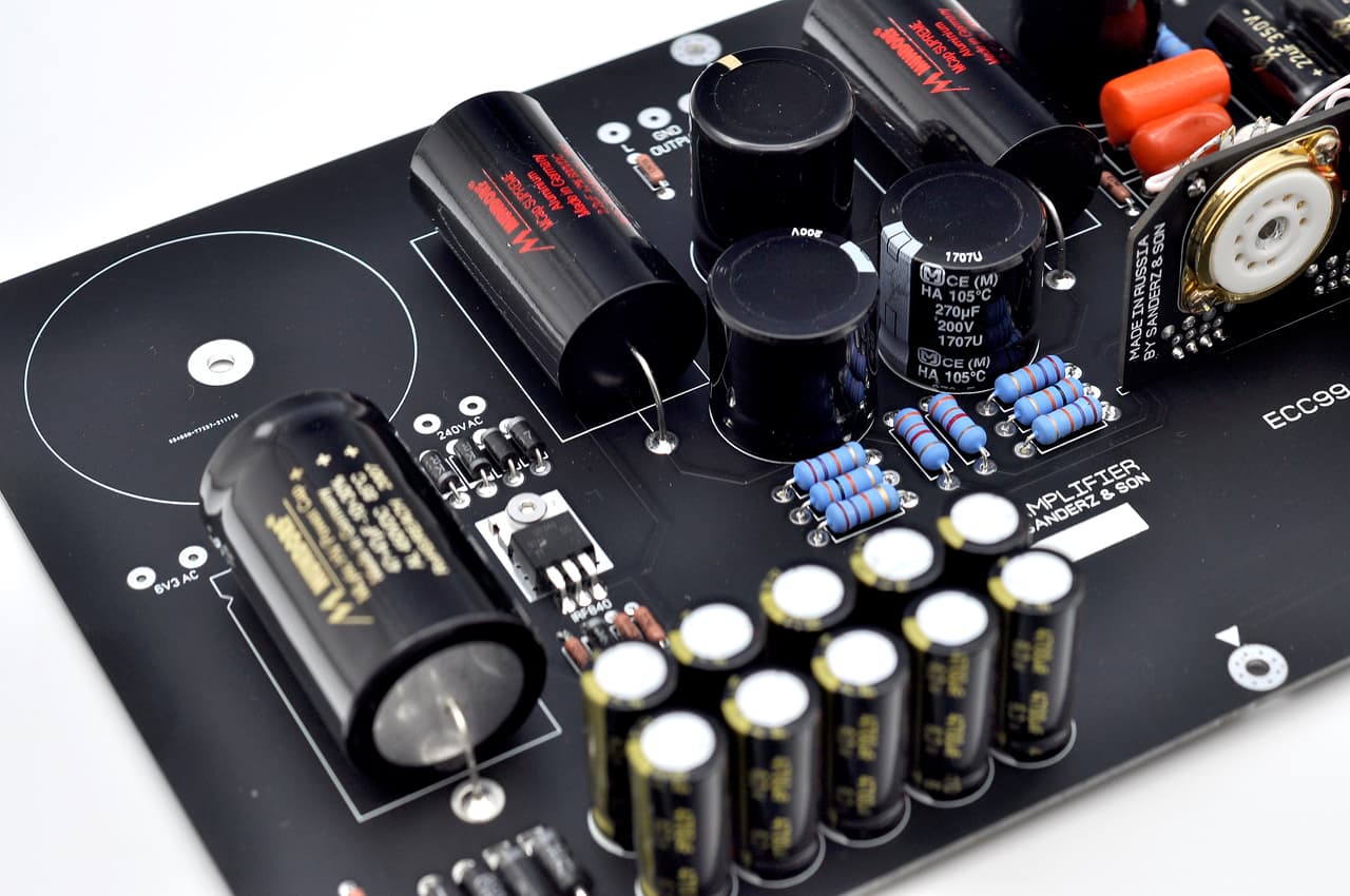 Изготовлен вручную, с использованием только высококачественных комплектующих, таких, как конденсаторы Mundorf Supreme, Mundorf M-Lytic HV, Orange Drop, F&T, резисторы Vishay DALE 1%.