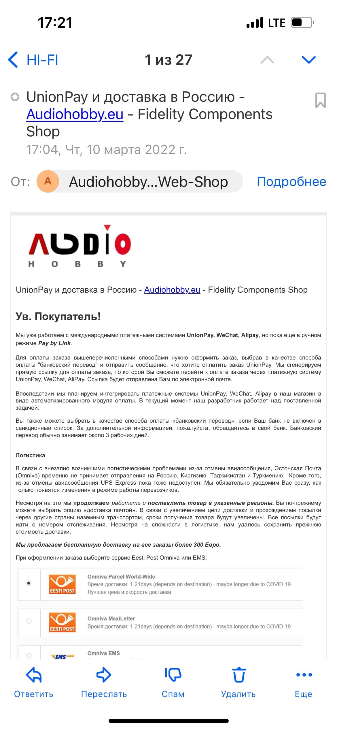 Заказывал 20 февраля. Доставку отменили. 21 вернули деньги. Заказ отложили до решения с обстановкой.