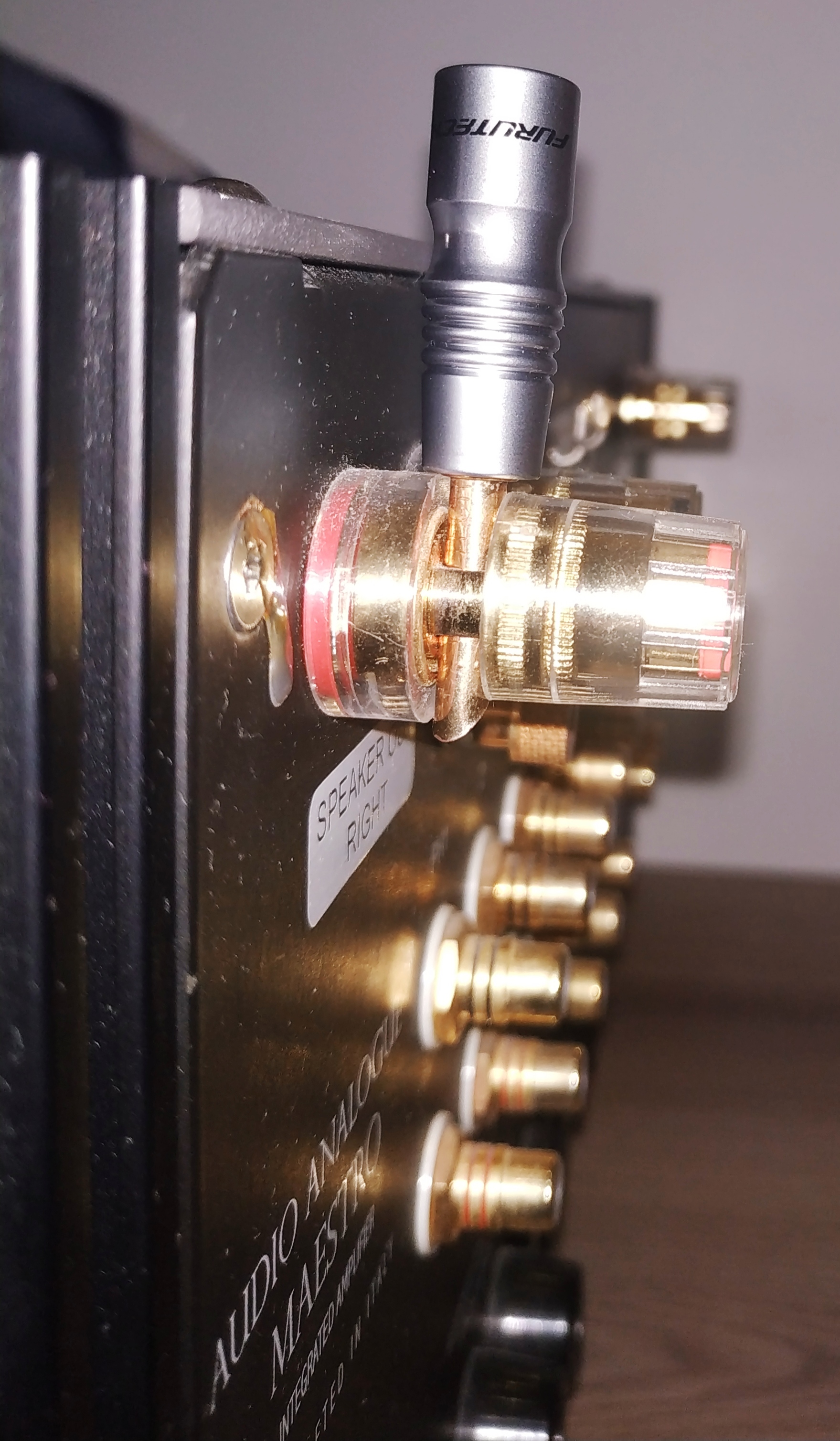 бананы типа Furutech FP-200B(G) или Audio Note AN-BP точно подходят к отверстиям в акустических терминалах этого усилителя.