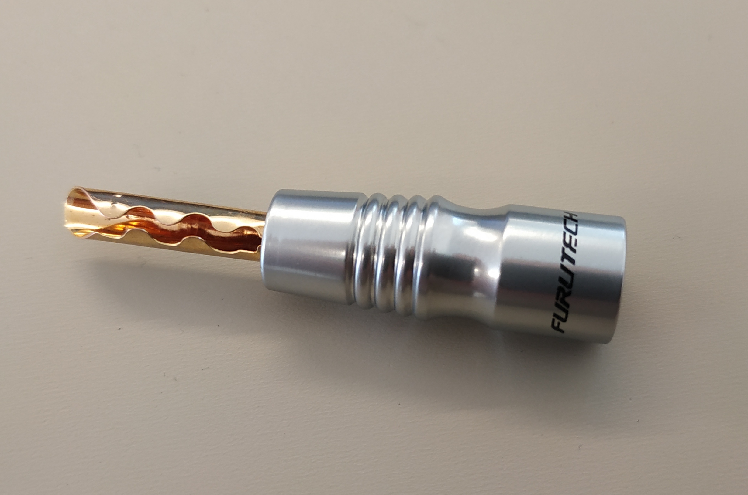 Денис, я нашел банан Фурутек. Диаметр его пина - 5,5 мм, он входит в отверстие акустического терминала усилителя без каких-либо проблем, без натяга.
