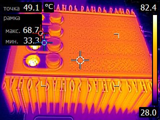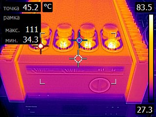 Это самый верх ламп, и рядом с ними. Термограммы сделал, после трех часов работы усилителя после включения. На фото , самые светлые участки - это и самые горячие участки по температуре.А так и корпус возле ламп здорово прогревается, теплый(горячий поток) пожет по разному нагревать усилитель.Также середина и верхняя часть поверхности радиаторов,выходных траназисторов сильно разогревается.