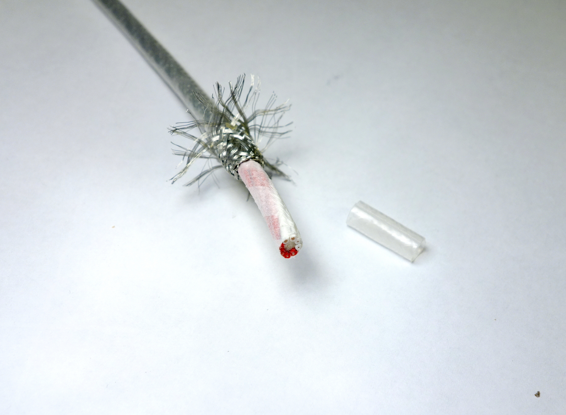 Под толстой прозрачной оболочкой (внешний диаметр 6,5 мм) расположен экран плотного плетения из облуженной проволоки. Пучок проводов обернут двумя слоями целлюлозной (не синтетической) ленты разной ширины.