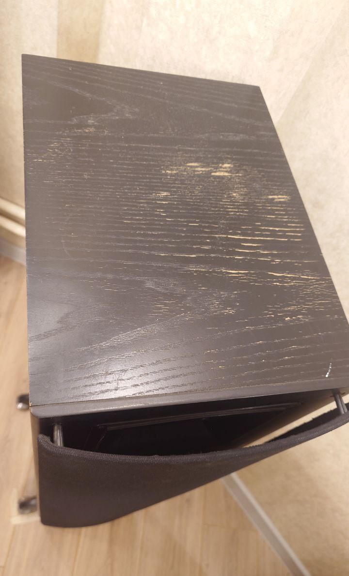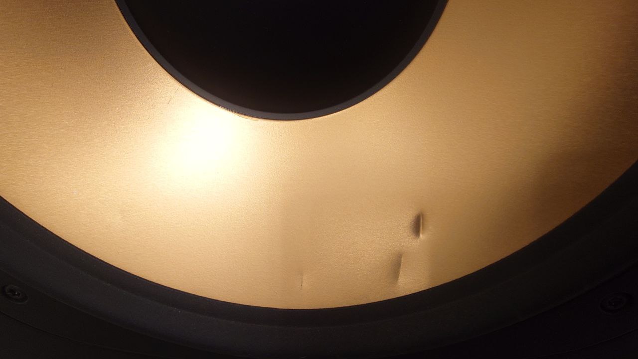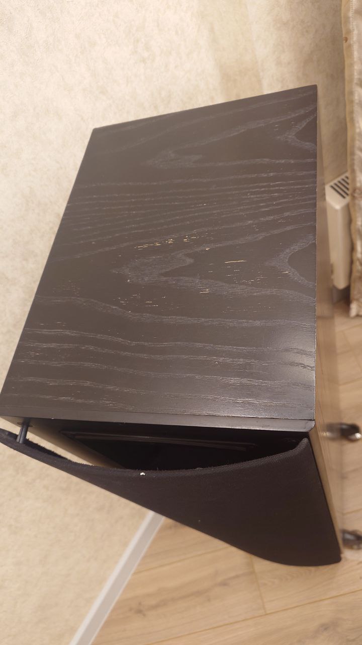 Есть недостатки, на одной АС вмятины и царапины на басовиках (есть на фото), на звук не влияет. Потерт шпон на верхней стороне. На одном из грилей отломились 2 пластиковых соединителя.